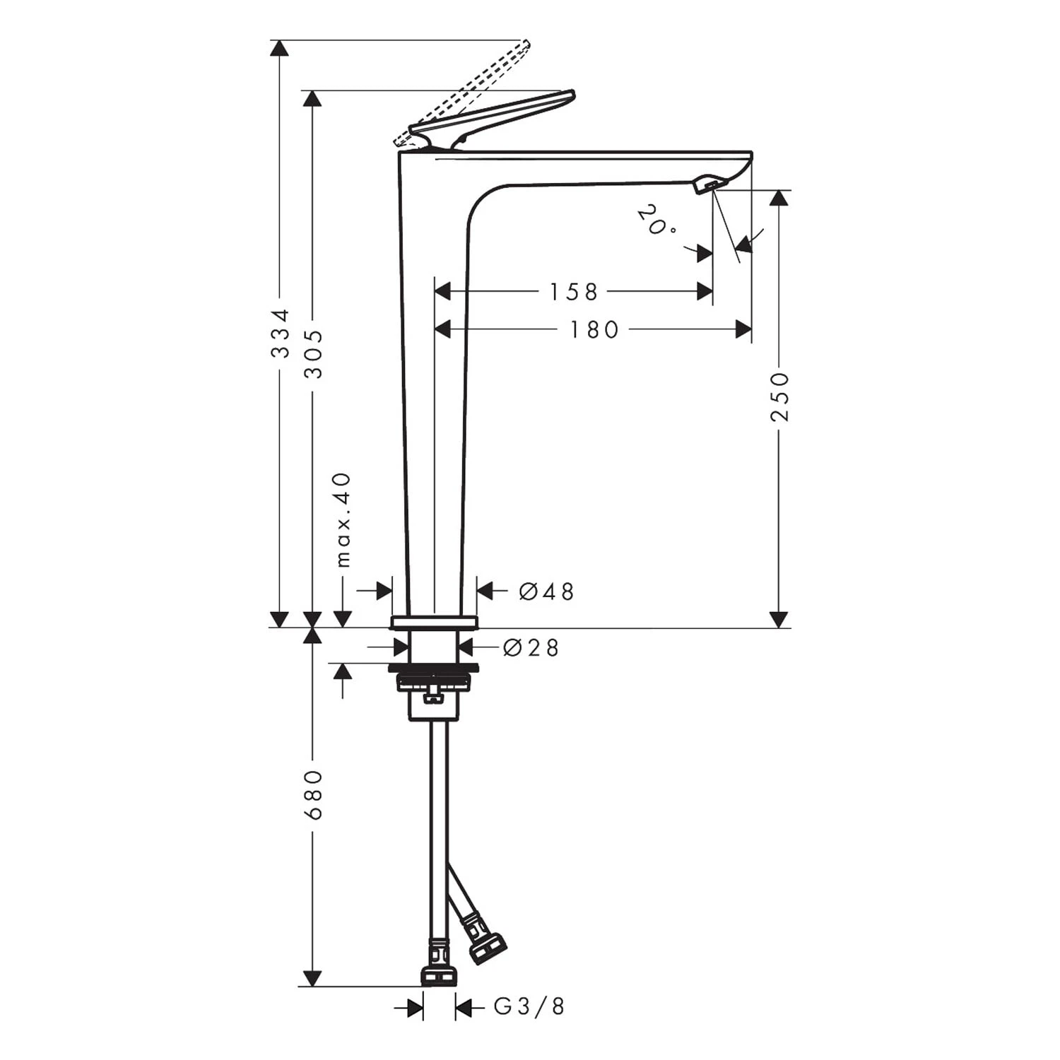 Eigenschaften: besteht aus: Einhebel-Waschtischmischer, Ablaufgarnitur ComfortZone: 250 Ausladung:15,8 cm Auslaufhöhe: 25 cm Griffvariante: Hebelgriff Strahlart: Normalstrahl maximale Durchflussmenge bei 3 bar: 5 l/min Keramikmischsystem für Durchlauferhitzer geeignet unverschließbare Ablaufgarnitur Anschlussart: G 3/8 Anschlussschläuche Anschlussgröße: DN15 Kaltwasser in Griff-Grundstellung EU-Taxonomie: max. 6 l/min – wesentlicher Beitrag (SC) möglich