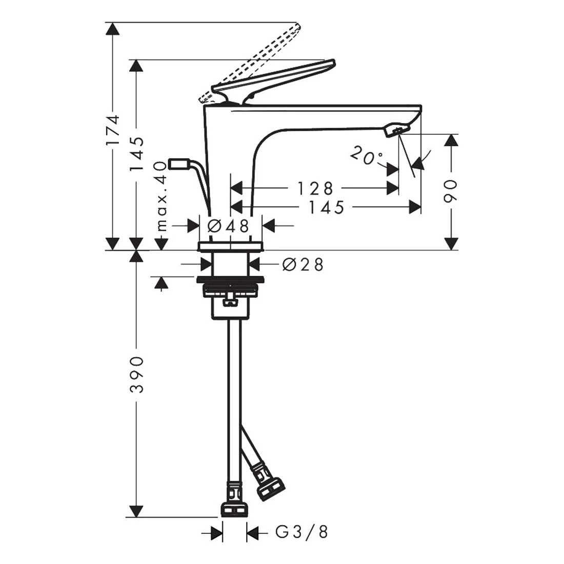 Eigenschaften: besteht aus: Einhebel-Waschtischmischer, Ablaufgarnitur ComfortZone: 90 Ausladung: 12,8 cm Auslaufhöhe: 9 cm Griffvariante: Hebelgriff Strahlart: Normalstrahl maximale Durchflussmenge bei 3 bar: 5 l/min Keramikmischsystem für Durchlauferhitzer geeignet Zugstangen-Ablaufgarnitur (?) Zugstangen-Ablaufgarnitur Excenter-Garnitur ist der Ablauf unten im Waschbecken. G 1¼ Anschlussart: G 3/8 Anschlussschläuche Anschlussgröße: DN15 Kaltwasser in Griff-Grundstellung EU-Taxonomie: max. 6 l/min – wesentlicher Beitrag (SC) möglich