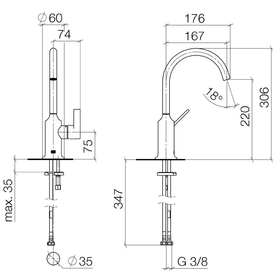 Eigenschaften: schwenkbarer Auslauf 360° runder luftangereicherter Strahl Höhe bis Luftsprudler 22 cm Bohrungsdurchmesser 3,5 cm 2x Druckschlauch M 8 x 1 eingeschraubt, dichtheitsgeprüft Durchfluss max. 5,7 l/min bleifrei