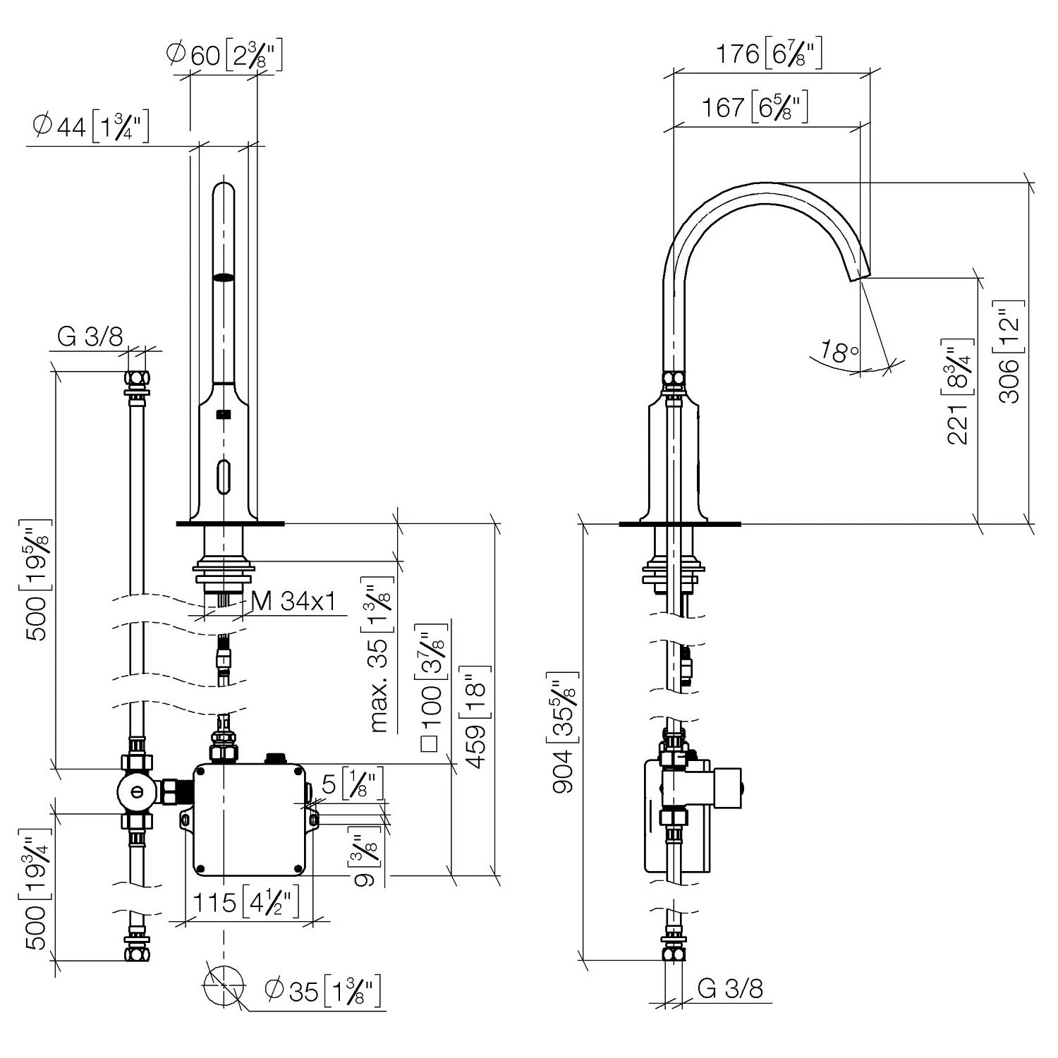 Eigenschaften;: mit elektronischer Öffnungs- und Schließfunktion ohne Ablaufganitur Infrarot-Sensorik Höhe bis Luftsprudler 22,1 cm Bohrungsdurchmesser 3,5 cm starrer Auslauf Durchfluss max. 5,7 l/min runder luftangereicherter Strahl geeignet zur thermischen Desinfektion kontinuierlicher Wasserfluss (automatische Abschaltfunktion bei Überschreitung der Nachlaufzeit) indirekte Temperaturregulierung (Untertischbox) Untertischbox inklusive anpassbarer Erfassungsbereich des Sensors Batterie- und Netzteilbetrieb möglich benötigte Batterie: 4x AA (1.5V) – nicht im Lieferumfang enthalten 2x Druckschlauch M 8 x 1 eingeschraubt, dichtheitsgeprüft bleifrei