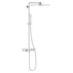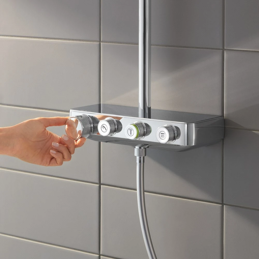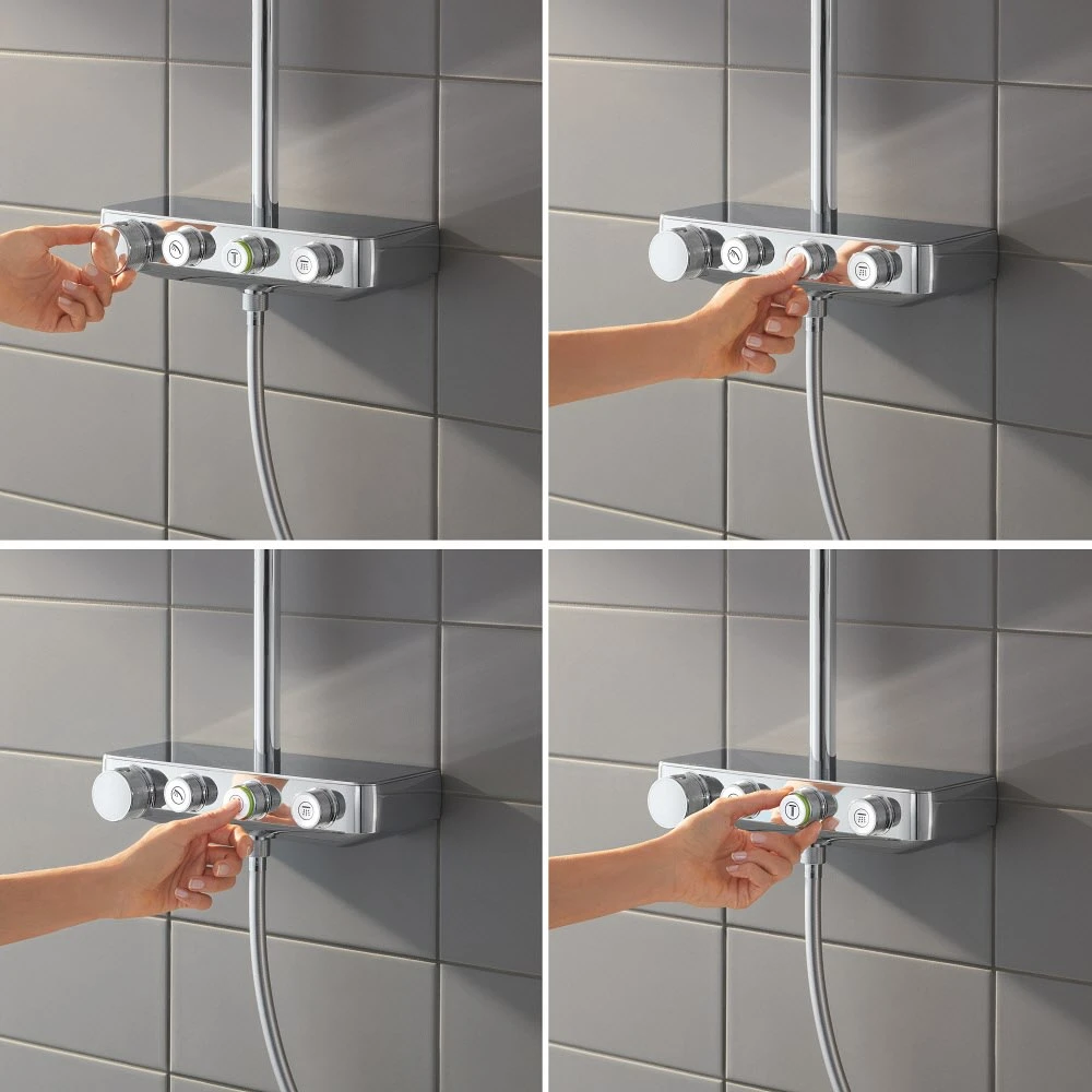 bestehend aus: horizontaler Duscharm, 45 cm Aufputz-Thermostat mit SmartControl: An/Aus per Knopfdruck und Volumensteuerung durch Drehen Handbrause Euphoria cube Kopfbrause Rainshower SmartActive 310 Cube Brauseschlauch Silverflex 175 cm Eigenschaften: Wechsel zwischen Kopfbrause Rainshower 310 SmartActive Cube, GROHE PureRain und Jet Strahl obere Konsole variabel zur minimalen Anpassung an vorhandene Bohrlöcher Handbrause in der Höhe verstellbar mittels Gleitelements GROHE DreamSpray perfektes Strahlbild GROHE Long-Life Oberfläche GROHE CoolTouch – kein Verbrennen an heißen Oberflächen GROHE TurboStat Kompaktkartusche mit Dehnstoff-Thermoelement GROHE EcoJoy Wasserspar-Technologie GROHE SafeStop Sicherheitssperre bei 38°C und zusätzlich optional einsetzbarer Temperaturendanschlag bei 43°C integrierte GROHE EasyReach Duschablage SpeedClean Antikalk-System innenliegende separate Wasserführung Twistfree gegen Verdrehen des Brauseschlauchs für Durchlauferhitzer ab 18 kW geeignet