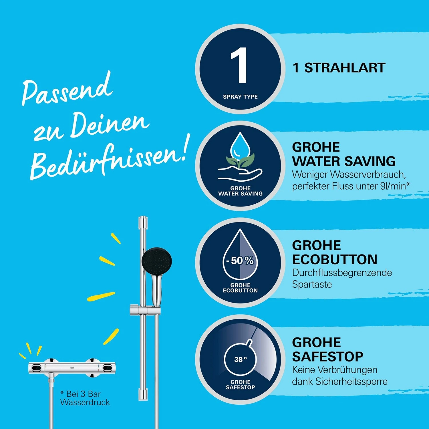 Genießen Sie jeden Tag moderne Duschtechnologie mit der GROHE Precision Flow Brausegarnitur. Durch die robuste und pflegeleichte GROHE Long-Life Oberfläche verliert das System nie sein strahlendes Aussehen. Ein GROHE QuickFix-Produkt für schnelle und mühelose Montage. Eigenschaften: Precision Flow Thermostat-Brausebatterie 1/2″ Wandmontage GROHE SafeStop Taste ist auf 38 °C eingestellt zum Schutz vor Verbrühungen GROHE Thermostat-Technologie garantiert eine konstante Wassertemperatur GROHE QuickSpanner für Montage ohne weiteres Werkzeug Handbrause Vitalio Start 110 1 Strahlart: Rain maximaler Durchfluss (bei 3 bar): 8,5 l/min ShockProof Silikonring schützt vor Beschädigung bei Herunterfallen der Brause Inner WaterGuide Innenliegende separate Wasserführung SpeedClean Antikalk-System, einfach mit dem Finger von Kalkablagerungen befreit GROHE Water Saving weniger Wasser, perfekter Wasserfluss GROHE DreamSpray für ein perfektes Strahlbild in der Höhe verstellbar mittels Gleitelement Brauseschlauch VitalioFlex 175 cm, knickfest Universalanschluss 1/2″ x 1/2″ Hitzebeständig bis 70°C Druckbeständigkeit bis 5 bar Brausestange 60 cm mit Gleitelement und schwenkbarer Halterung, sodass Höhe und Winkel der Brause ganz einfach und leichtgängig eingestellt werden können die obere Halterung ist höhenverstellbar, bereits vorhandene Bohrlöcher können genutzt werden geeignet zum Bohren (Schrauben und Dübel beiliegend) oder Kleben (GROHE QuickGlue separat erhältlich) Belastbarkeit: max. 20 kg