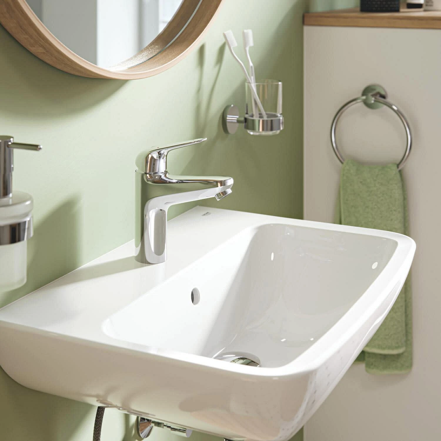 Überzeugen Sie sich selbst, welchen Effekt Sie mit der neuen GROHE Swift Waschtischarmatur in GrößeM bei der Neugestaltung Ihres Badezimmers erzielen können. Mit dem neuen Design und den optimierten Funktionen ist die GROHE Swift nicht nur einfach zu montieren, sondern bietet auch pures Bedienvergnügen. Die praktische Zugstangen-Ablaufgarnitur (?) Zugstangen-Ablaufgarnitur Excenter-Garnitur ist der Ablauf unten im Waschbecken. wird über eine kleine Stange an der Rückseite der Armatur betätigt. So lässt sich der Ablauf einfach öffnen und schließen, ohne dass Ihre Hände nass werden. Mit der langlebigen GROHE Long-Life Keramikkartusche im Inneren der Armatur lassen sich Wassermenge und -temperatur leichtgängig und präzise regeln. Der integrierte Temperaturbegrenzer spart Energie und die GROHE Water Saving Wasserspartechnologie begrenzt den Wasserverbrauch auf 5l/min (bei 3bar)– ohne Abstriche bei der Leistung. Die isolierte innenliegende Wasserführung sorgt dafür, dass nur blei- und nickelfreies Wasser aus der Armatur kommt. Mit der robusten, pflegeleichten GROHE Long-Life Oberfläche glänzt diese Badezimmerarmatur außerdem auch nach vielen Jahren im Gebrauch noch wie am ersten Tag. Überraschend einfach! Die Armatur ist für die Einlochmontage konzipiert und lässt sich mit GROHE QuickTool, QuickGuide und QuickVideo im Handumdrehen installieren. Eigenschaften: Einlochmontage Bedienungshebel aus Metall GROHE Long-Life 2,8 cm Keramikkartusche mit Temperaturbegrenzer getrennte innenliegende Wasserwege – kein Kontakt mit Blei oder Nickel innerhalb der Armatur Schnell-Montage-System flexible Anschlussschläuche GROHE QuickTool im Lieferumfang