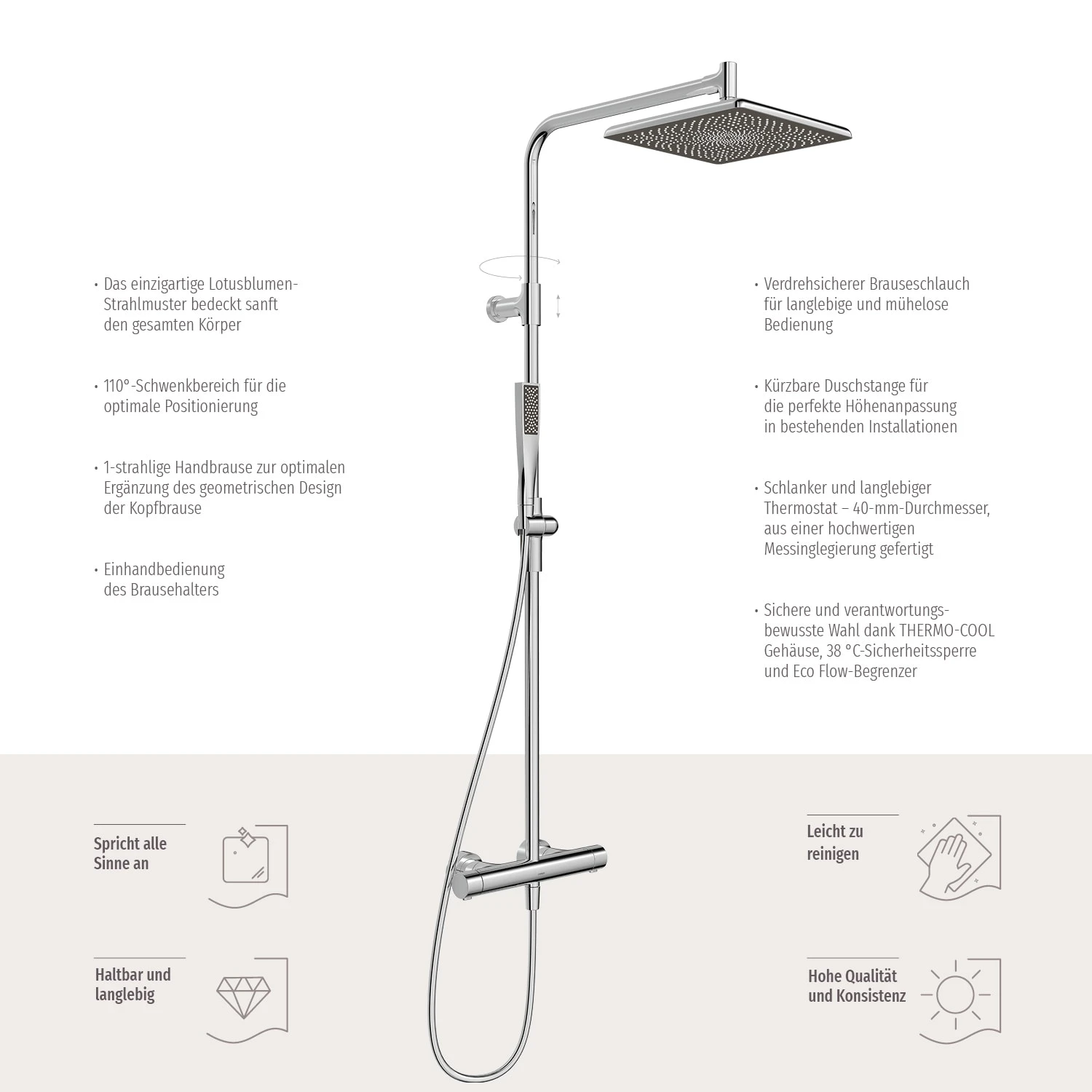 HANSAAURELIA: Duschmomente in perfekter Harmonie Inspiriert von der Lotusblüte, schafft HANSAAURELIA ein einzigartiges Duscherlebnis. Das durchdachte Design erzeugt unterschiedliche Wasserflusszonen – kraftvoll im Zentrum, sanft an den Rändern. Wie Blütenblätter umhüllt das Wasser den Körper und sorgt für pure Entspannung. Erleben Sie achtsame Wohlfühlmomente in Ihrem persönlichen Rückzugsort. Die perfekte Verbindung aus Design und Funktion bringt Wasser in seiner schönsten Form zur Geltung – natürlich, harmonisch, erfrischend. HANSAAURELIA – wo Natur und Wohlbefinden aufeinandertreffen. Eigenschaften Duschsystem: Wandmontiertes Duschsystem HANSAAURELIA mit Kopfbrause eckig, Stabhandbrause eckig, Thermostat, Schlauch und höhenverstellbarem Brausehalter. Lotusblüten-Strahlmuster mit unterschiedlichen Wasserflusszonen -in der Mitte dicht und voll, fließt das Wasser außen sanft in die Blütenblätter für ein rundum umhüllendes Duscherlebnis. Individuelle Installation: Kürzbare Duschstange für flexible Anpassung an jede Einbausituation. Saubere, schnelle und einfache Installation: Kompatibel mit allen gängigen Standard-S-Anschlüssen Hochwertige Komponenten: Keramik-Dichtscheiben für präzise Wassermengenregulierung, Thermostatkartusche für konstante Temperatur, Rückflussverhinderer und Schmutzfilter. Spar-Durchfuss bei 3 bar: 7,2 l/min Durchfuss bei 3 bar: 7,8 l/min Anschlussgröße: G 3/4 Material: Messing/Verbundwerkstoff Eigenschaften Kopfbrause: 1-strahlige und extra große Regen-Kopfbrause 25 x 25 cm mit stilvollem, architektonischem Design. Lotusblüten-Wasserfluss: Dichter, voller Strahl in der Mitte, sanfter Außenfluss für ein intensives Regenerlebnis. Schwenkbares Kugelgelenk für eine flexible Ausrichtung des Wasserstrahls. 110°-Schwenkbereich der Kopfbrause für eine präzise und flexible Positionierung der Kopfbrause und ein optimales Duschvergnügen. Anti-Kalk-Technik: Die Silikondüsen am Duschkopf verhindern Kalkablagerungen und ermöglichen eine einfache Reinigung mit nur einem Finger – weniger Wartung, mehr Komfort. Eigenschaften Stabhandbrause: Naturinspiriertes Design: Größe der Stabhandbrause 4 x 19,6 cm (B x H) 1-strahlige Handbrause mit Brauseschlauch (175 cm) Einhandbedienung des Brausehalters: Die einfache Höhenverstellung des Brausehalters ermöglicht eine individuelle Anpassung des Wasserstrahls. Hansa Twist guard: Verdrehsicherer Brauseschlauch für langlebige und mühelose Bedienung Anti-Kalk-Technik: Die Silikondüsen am Duschkopf verhindern Kalkablagerungen und ermöglichen eine einfache Reinigung mit nur einem Finger – weniger Wartung, mehr Komfort. Eigenschaften Therostat: Sicherheitssperre bei 38°C schützt vor Verbrühungen – für mehr Sicherheit in der Dusche. THERMO-COOL Technologie sorgt dafür, dass das Thermostat-Gehäuse nicht überhitzt, was es deutlich sicherer macht als herkömmliche Thermostatarmaturen. ECO Flow-Technologie: Der Durchflusseinstellgriff ermöglicht eine Wassereinsparung, während der Temperatureinstellgriff die präzise Anpassung der Wassertemperatur ermöglicht. Der Hebel ist mit einer W+K-Kennzeichnung versehen, um den Wasserfluss besser zu regulieren. Lieferumfang: 1x Schwenkbare Kopfbrause eckig 1x Stabhandbrause eckig 1x Thermostat (THERMO-COOL) 1x Brauseschlauch 1x Brausestange 1x Verstellbare Brausestangehalterung 1x Montageanleitung