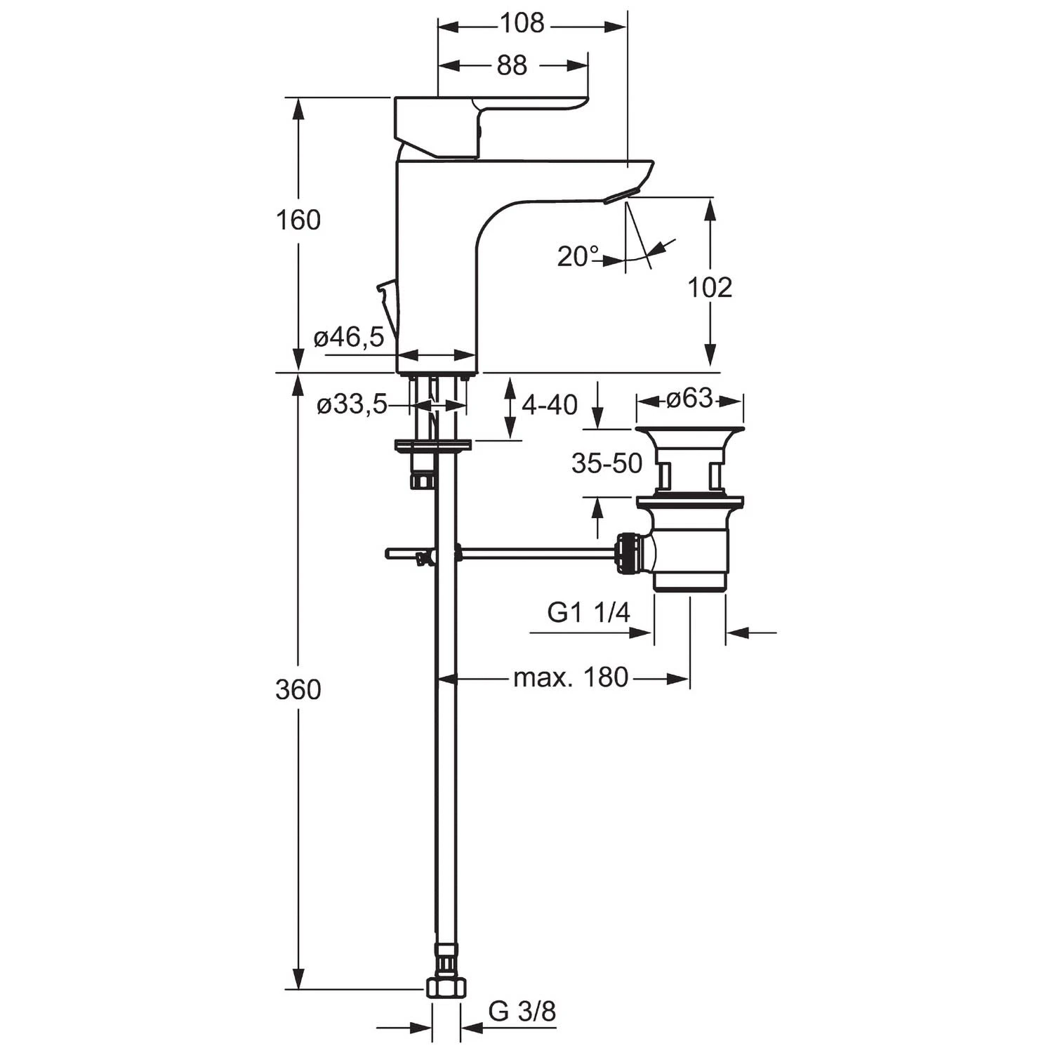Eigenschaften: Durchfluss 6 l/min (gemessen bei 3 bar Fließdruck) Bedienungshebel (Metall) Ablaufgarnitur (Metall) Anschluss über flexible Druckschläuche G 3/8 Auslauf starr, gegossen Höhe 16 cm Ausladung 10,8 cm