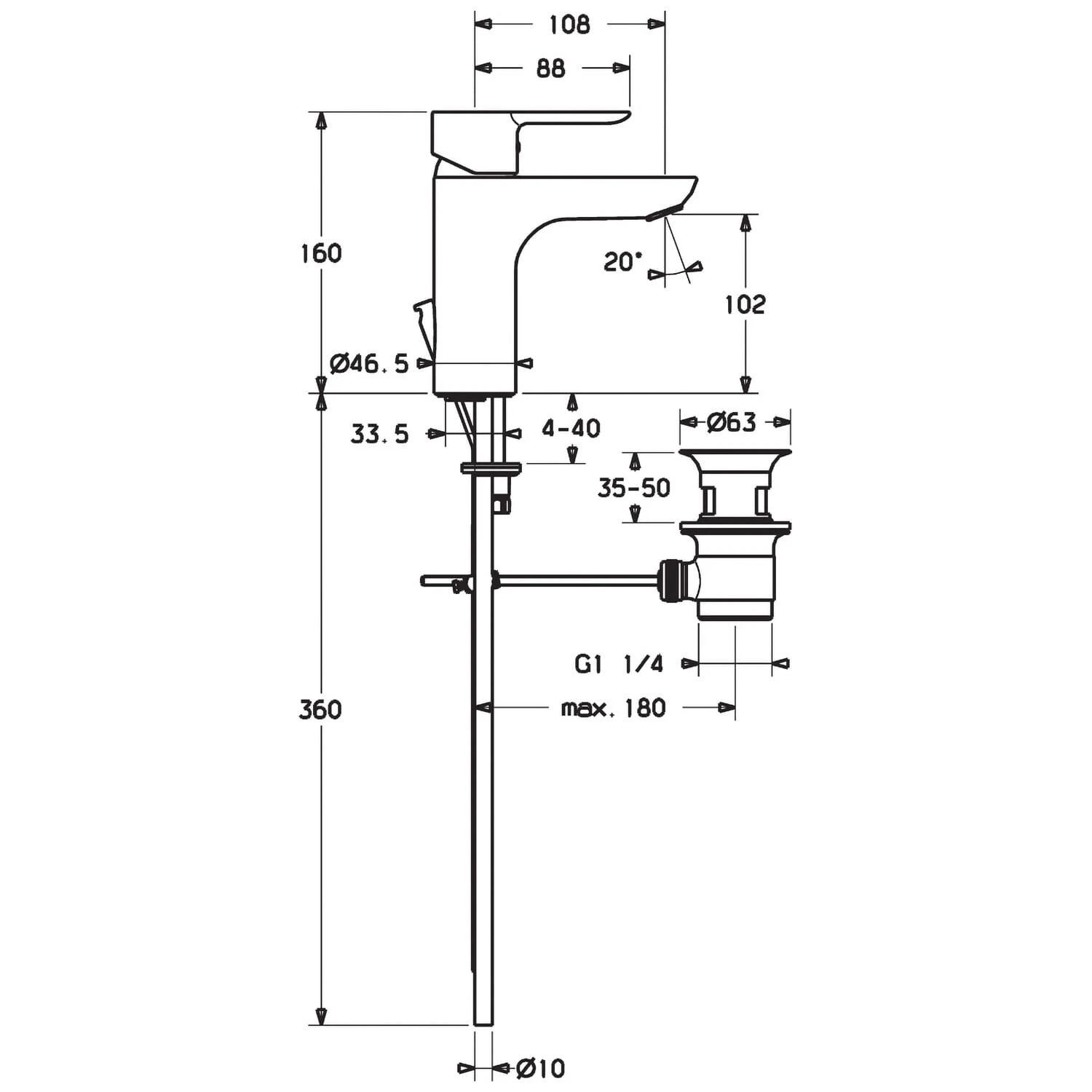Eigenschaften: Bedienungshebel Metall Ablaufgarnitur 1 1/4″ Anschluss über Kupferrohre Auslauf starr gegossen Höhe 16 cm Ausladung 10,8 cm