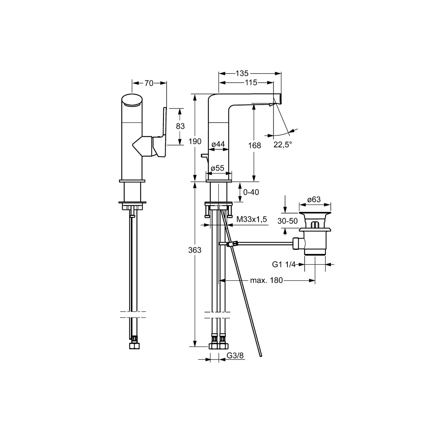 Eigenschaften: Durchflussmenge: 6 l/min, gemessen bei 3 bar Fließdruck Bedienungshebel (Metall), seitlich bedient Luftsprudler, konstante Durchflussleistung unabhängig vom Fließdruck verbesserter Kalkschutz durch die HONEYCOMB® Struktur Ablaufgarnitur (Metall) und Zugbetätigung Befestigung über Gewindestutzen Anschluss über flexible Druckschläuche G 3/8 Auslauf gegossen, 150° schwenkbar, herausnehmbarer Anschlag Armaturenkörper: entzinkungsarmes Messing Oberflächen in Trinkwasserkontakt sind frei von Nickelbeschichtung Gesamthöhe: 19 cm Ausladung: 11,5 cm