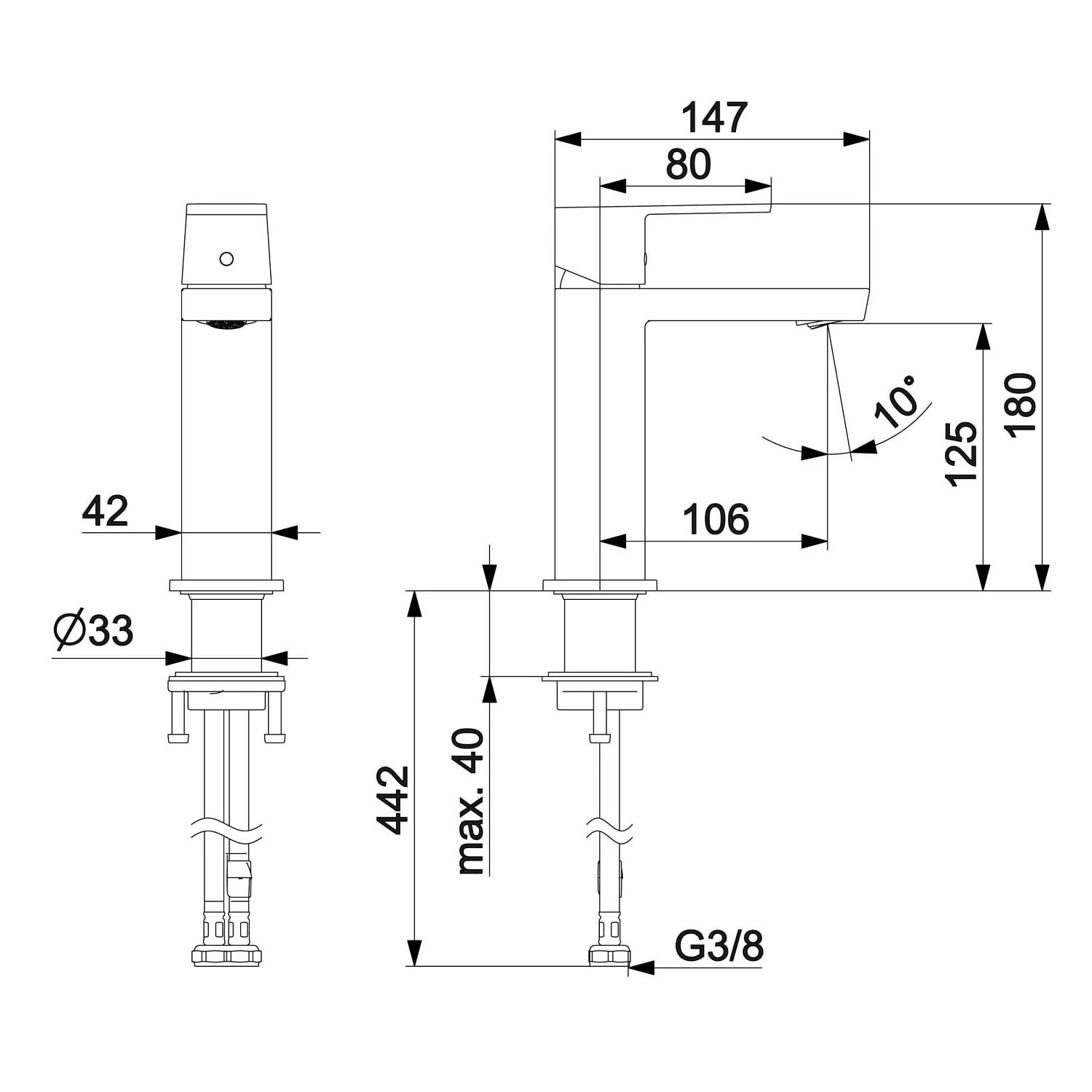 Eigenschaften: Einhebelmischer, Standmontage feststehender Auslauf Bedienebel mit W+K-Kennzeichnung ohne Ablaufgarnitur PCA® konstante Durchflussleistung unabhängig vom Fließdruck, schwenkbar Ø 2,5 Steuerpatrone mit keramischen Dichtscheiben zur Wassermengen- und Temperatureinstellung Anschluss über flexible Druckschläuche G 3/8 Armaturenkörper aus entzinkungsbeständigem Messing (DZR) Durchfluss bei 3 bar (mit Durchflussregler)r: 4,8 l/min Gesamthöhe: 18 cm Ausladung: 10,6 cm