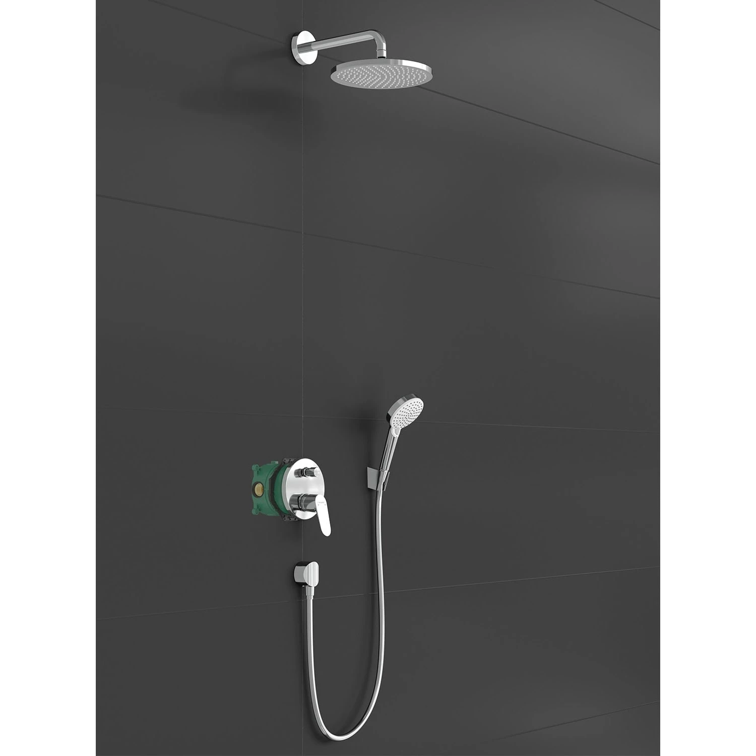Eigenschaften: 7 in 1: alles aus einer Hand – die Designkompetenz von hansgrohe bietet die Basis für moderne Badgestaltung Lieferumfang: Brausesystem, Befestigungsmaterial, Montageanleitung Regendusche: Die Strahlart Rain verwöhnt Tag für Tag Mehr Abwechslung: Der Duschkopf verwöhnt mit der Strahlart Rain, die Handbrause mit den Strahlarten Rain und IntenseRain Schnelle Strahlumstellung: direkt am Duschkopf durch Drehen der Strahlscheibe Einfach zu bedienen: Über den eleganten Griff des Einhebelmischers werden Temperatur und Wassermenge leichtgängig eingestellt Mehr Platz in der Dusche: Grundset ibox universal für eine Unterputz-Installation im Lieferumfang enthalten Länger wie neu: Kalk lässt sich einfach von den Silikondüsen am Duschkopf abwischen (QuickClean) Großartiges Wasservergnügen: die Kopfbrause liefert ca. 18 l/min, die Handbrause bis zu 14 l/min (je bei 3 bar) Komfort auf ganzer Länge: mit 1,25 m langem Duschschlauch für große Bewegungsfreiheit. Eine spezielle Befestigung verhindert lästiges Verdrehen Griffbereit: Mit dem praktischen Brausehalter ist der Duschkopf stets aufgeräumt und bequem erreichbar In allen Bestandteilen sind Premium-Materialien verbaut – für mehr Sicherheit und Nachhaltigkeit im Haushalt hansgrohe seit 1901 – die Premium-Marke für zuverlässige Bad- und Küchenprodukte 5 Jahre freiwillige Herstellergarantie auf ein Produkt, das nach höchsten Qualitätsstandards gefertigt wurde