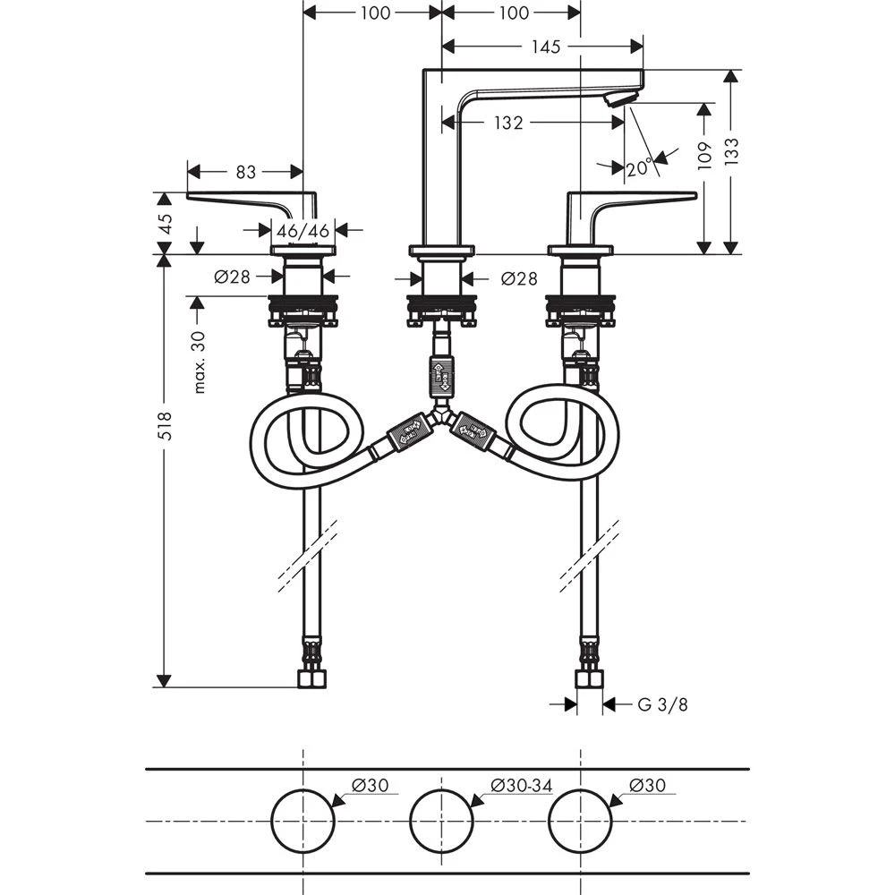 Eigenschaften: Besteht aus: 3-Loch Waschtischarmatur, Ablaufgarnitur ComfortZone 110 Ausladung 132 mm Durchflussmenge bei 3 bar: 5 l/min Keramikventile heiß/ kalt 90° für Durchlauferhitzer geeignet Push-Open Ablaufgarnitur G 1¼ Material Ablaufventil: Metall Anschlussart: G ⅜ Anschlussschläuche Anschlussgröße: DN15 Lieferumfang: Grund- und Fertigset mit Bügelgriffen und Push-Open Ablaufgarnitur