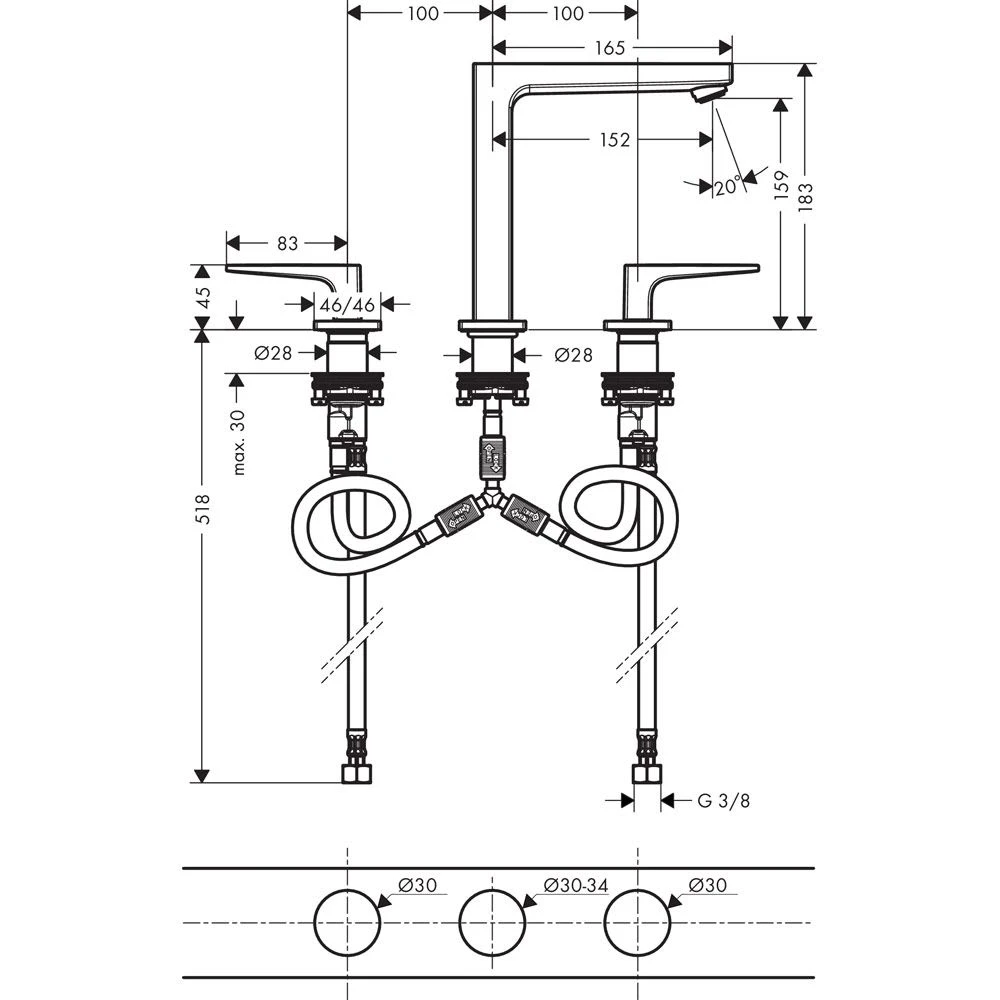 Eigenschaften: Besteht aus: 3-Loch Waschtischarmatur, Ablaufgarnitur ComfortZone 160 Ausladung 152 mm Durchflussmenge bei 3 bar: 5 l/min Keramikventile heiß/ kalt 90° für Durchlauferhitzer geeignet Push-Open Ablaufgarnitur G 1¼ Material Ablaufventil: Metall Anschlussart: G ⅜ Anschlussschläuche Anschlussgröße: DN15 Lieferumfang: Grund- und Fertigset mit Bügelgriffen und Push-Open Ablaufgarnitur