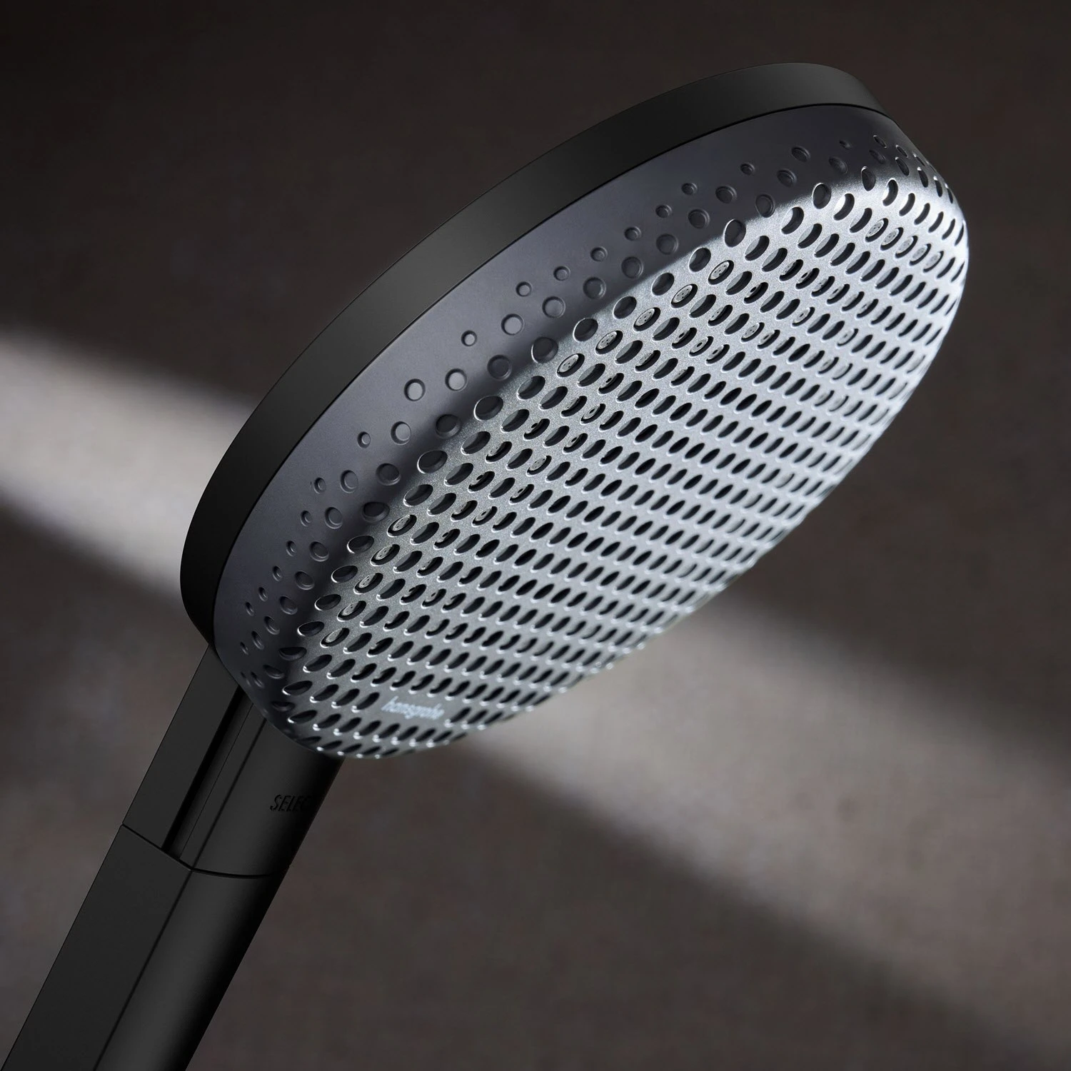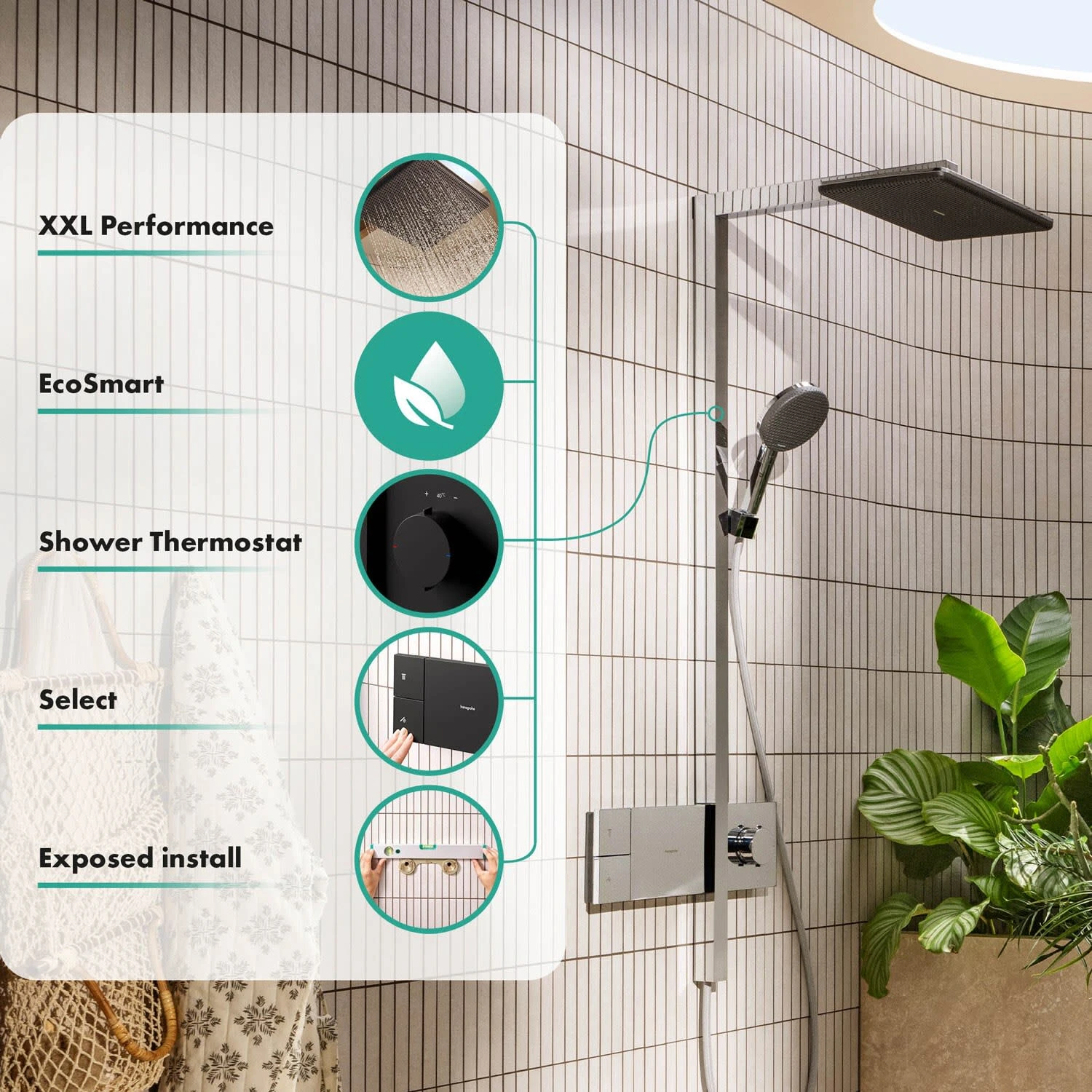 Begeisterung – neu komponiert. Raindance Alive Q 210/340 EcoSmart Duschsystem mit Thermostat (1 Strahlart) Ankommen und aufatmen! Mit hansgrohe Raindance Alive Q 210/340 EcoSmart (1 Strahlart) haben Sie gefunden, was Sie suchen. Ein harmonisch aufeinander abgestimmtes Duschsystem für mehr Geborgenheit, Entspannung und Erfrischung. Ein erster Blick enthüllt das Besondere. Inspiriert von einer Symbiose aus Wasser, Mensch und Raum zelebriert Raindance Alive das Lebenselixier. Und es schenkt Ihnen etwas, das noch kostbarer als Wasser ist: Zeit für sich selbst. Vertrauter Name. Vollkommen neues Gefühl Meisterliches Design: ikonisch und zeitlos überdauert es kurzlebige Trends. Entworfen in Zusammenarbeit mit dem renommierten Studio Phoenix Wohlfühlatmosphäre: Die moderne Gestaltung des Duschkopfs strahlt Wärme aus und macht das Badezimmer wohnlicher Große Auswahl: Je nach Stimmung wählen Sie mit einem Tastendruck (Select) zwischen drei Strahlarten an der Handbrause. Die Kopfbrause verwöhnt mit der Strahlart Rain – je nach Vorliebe können Sie alternativ auch hansgrohe PowderRain voreinstellen Verantwortung für morgen? Mit Vergnügen! Die EcoSmart-Technologie von hansgrohe verringert den Wasserverbrauch mit einem flexiblen Durchflussbegrenzer auf max. 8 l/min (3 bar) – ohne Einbußen beim Duschkomfort Weitere Besonderheiten Unbeschwert duschen: Das Thermostat hält Ihre Wunschtemperatur gleichmäßig ein und schützt vor zu heißem Wasser Auch für kalkhaltiges Wasser geeignet: Die eloxierte Abdeckung lässt sich leicht abnehmen und reinigen Skulpturales Design – einfach eingebaut: Ihr hansgrohe Duschsystem wird von außen montiert (Aufputz). Die Wand bleibt unversehrt Markenqualität: 5 Jahre freiwillige Herstellergarantie und ausgesuchte Materialien bewahren das Besondere für lange Zeit Eigenschaften: Duschvergnügen: Extra großer Duschkopf (21 x 34 cm), der den ganzen Körper in wohlig warmes Wasser einhüllt Wohlfühlatmosphäre: Die Mesh-Abdeckung strahlt Wärme aus und macht das Badezimmer wohnlicher Zeitlos schön: Matt Black und eine Strahlscheibe in Graphit schaffen ein faszinierendes Design Wahlmöglichkeit: Verwöhnt ab Werk mit Rain. Ein Wechsel zu hansgrohe PowderRain ist jederzeit möglich Schenkt neue Energie: Die Strahlart Rain erfrischt mit kräftigem Brauseregen *EcoSmart: Benötigt dank eines flexiblen Durchflussbegrenzers max. 8 l/min – ohne Einbußen beim Duschkomfort Einfach eingebaut: Mitgelieferte S-Anschlüsse werden auf den Wasserauslass geschraubt – die Wand bleibt unversehrt Wasser an – Alltag aus: Die Thermostatfunktion verwöhnt mit einer gleichmäßigen Wassertemperatur Schwerelos duschen: der Textil-Duschschlauch ist leichter und flexibler als ein Standardschlauch von hansgrohe Mehr Komfort auf Knopfdruck: Mit der Select-Taste von hansgrohe lässt sich das Wasser schnell an- und abstellen Die Lösung gegen Kalk: Flexible Silikondüsen unter der Abdeckung lassen sich leicht abwischen (QuickClean) Erstmals in einer Handbrause: die beiden hansgrohe Strahlarten RainAir und PowderRain. Ergänzt von einem Massagestrahl 5 Jahre freiwillige Herstellergarantie auf ein Produkt, das nach höchsten Qualitätsstandards gefertigt wurde In allen Bestandteilen sind Premium-Materialien verbaut – für mehr Sicherheit und Nachhaltigkeit im Haushalt hansgrohe seit 1901 – die Premium-Marke für zuverlässige Bad- und Küchenprodukte Lieferumfang: Rosetten S-Anschlüsse Showerpipe mit Thermostat Befestigungsmaterial Montageanleitung