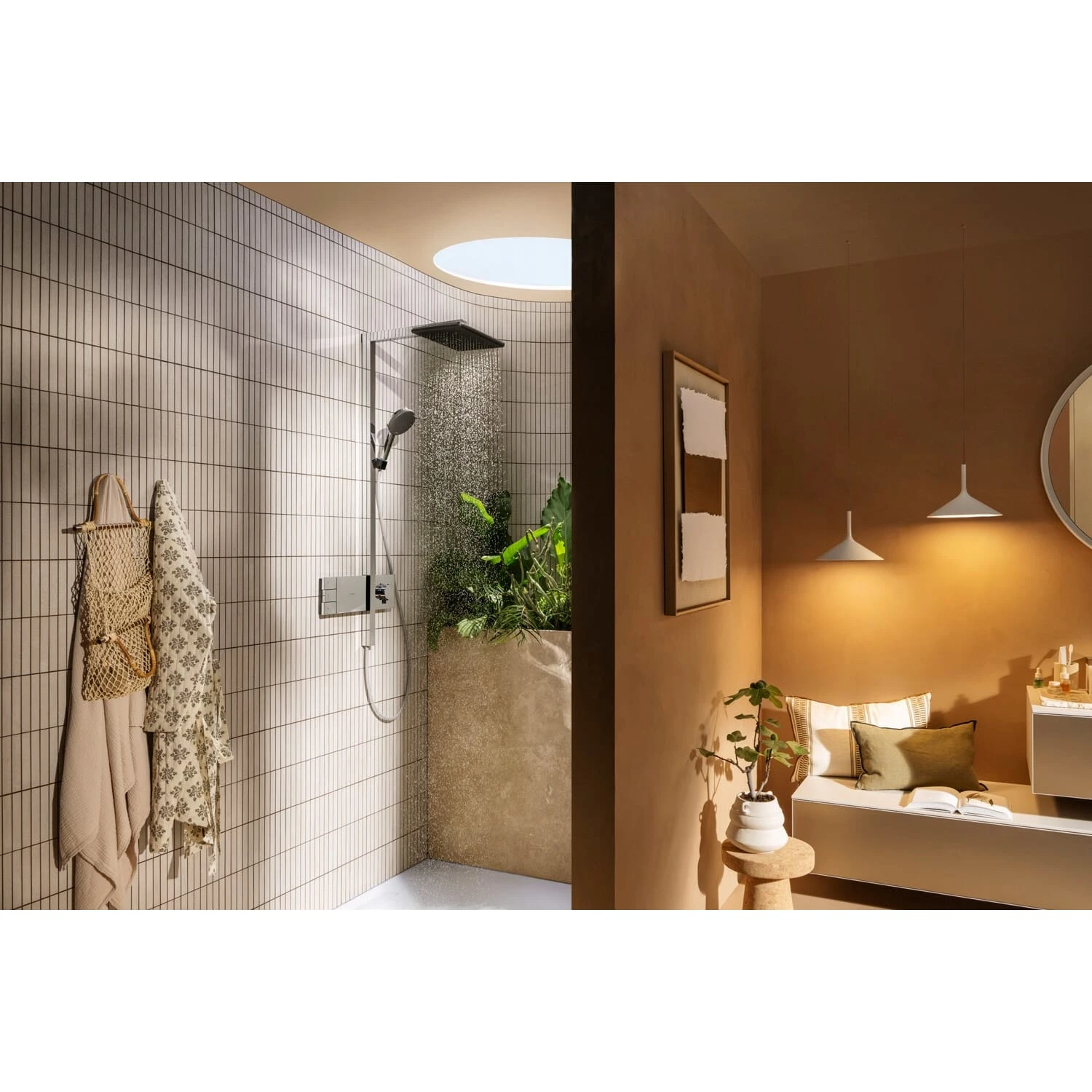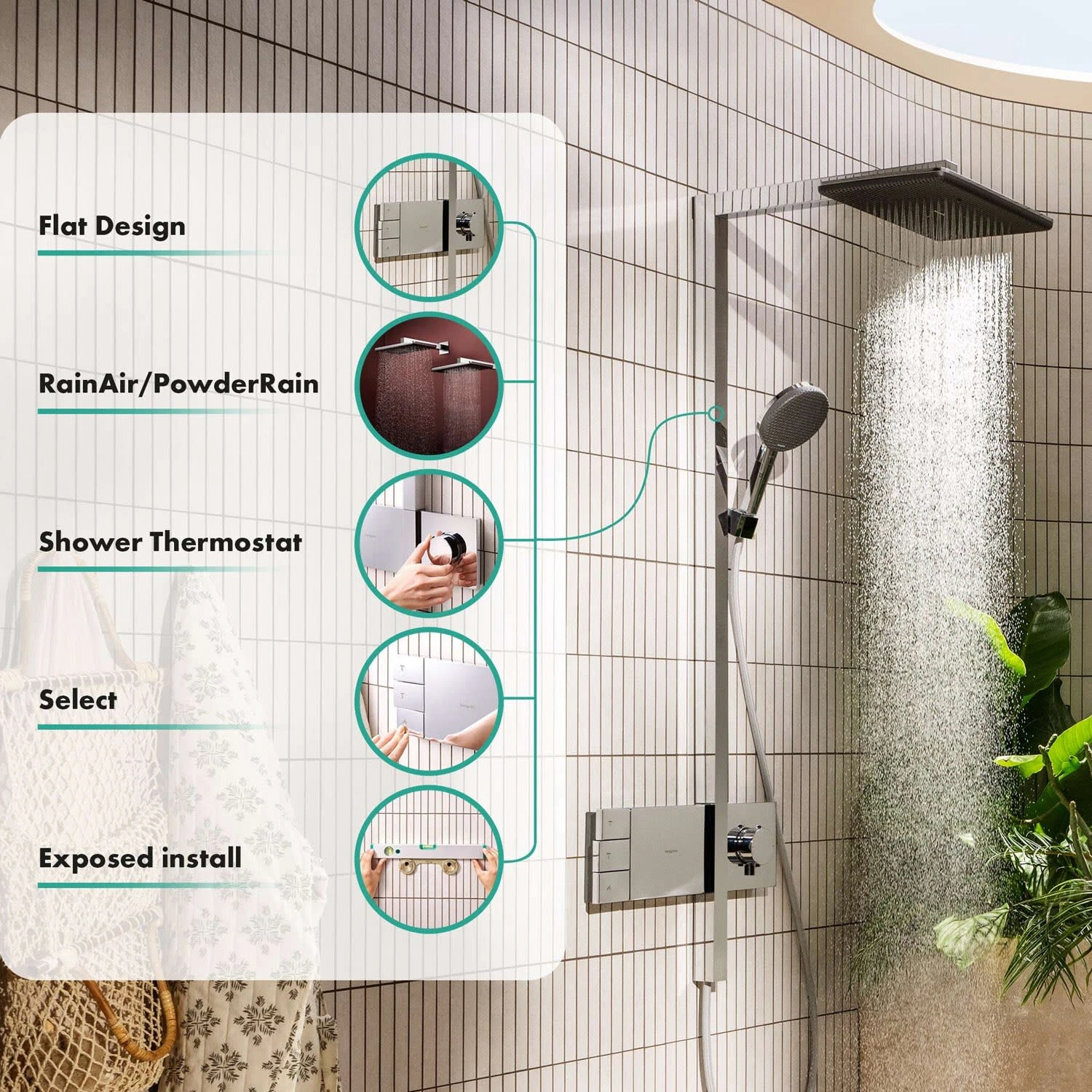 Begeisterung – neu komponiert. Raindance Alive Q 210/340 Duschsystem mit Thermostat (2 Strahlarten) Ankommen und aufatmen! Mit hansgrohe Raindance Alive Q 210/340 (2 Strahlarten) haben Sie gefunden, was Sie suchen. Ein harmonisch aufeinander abgestimmtes Duschsystem für mehr Geborgenheit, Entspannung und Erfrischung. Ein erster Blick enthüllt das Besondere. Inspiriert von einer Symbiose aus Wasser, Mensch und Raum zelebriert Raindance Alive das Lebenselixier. Und es schenkt Ihnen etwas, das noch kostbarer als Wasser ist: Zeit für sich selbst. Vertrauter Name. Vollkommen neues Gefühl Belebende Erfahrung: hansgrohe Raindance Alive bietet extra großes Duschvergnügen voller Wohlbehagen und Komfort Meisterliches Design: ikonisch und zeitlos überdauert es kurzlebige Trends. Entworfen in Zusammenarbeit mit dem renommierten Studio Phoenix Wohlfühlatmosphäre: Die moderne Gestaltung des Duschkopfs strahlt Wärme aus und macht das Badezimmer wohnlicher Große Auswahl: Je nach Stimmung wählen Sie mit einem Tastendruck (Select) zwischen drei Strahlarten an der Handbrause. Die Kopfbrause verwöhnt mit den beliebten Strahlarten RainAir oder PowderRain Weitere Besonderheiten Unbeschwert duschen: Das Thermostat hält Ihre Wunschtemperatur gleichmäßig ein und schützt vor zu heißem Wasser Auch für kalkhaltiges Wasser geeignet: Die eloxierte Abdeckung lässt sich leicht abnehmen und reinigen. Darunter verborgene, flexible Düsen werden durch Abwischen von Rückständen befreit Skulpturales Design – einfach eingebaut: Ihr hansgrohe Duschsystem wird von außen montiert (Aufputz). Die Wand bleibt unversehrt Markenqualität: 5 Jahre freiwillige Herstellergarantie und ausgesuchte Materialien bewahren das Besondere für lange Zeit Eigenschaften: Duschvergnügen: Extra großer Duschkopf (21 x 34 cm), der den ganzen Körper in wohlig warmes Wasser einhüllt Wohlfühlatmosphäre: Die Mesh-Abdeckung strahlt Wärme aus und macht das Badezimmer wohnlicher Zeitlos schön: Glänzendes Chrom und eine Strahlscheibe in Graphit schaffen ein faszinierendes Design Erstmals in einer Brause: die beiden herausragenden hansgrohe Strahlarten RainAir und PowderRain hansgrohe Regendusche: Die Strahlart RainAir umhüllt den Körper mit samtweichen Wassertropfen PowderRain: Verwöhnt mit tausenden mikrofeinen Tropfen wie ein sanfter Sommerregen Einfach eingebaut: Mitgelieferte S-Anschlüsse werden auf den Wasserauslass geschraubt – die Wand bleibt unversehrt Wasser an – Alltag aus: Die Thermostatfunktion verwöhnt mit einer gleichmäßigen Wassertemperatur Mehr Komfort auf Knopfdruck: Mit der Select-Taste von hansgrohe lässt sich das Wasser schnell an- und abstellen Auf Wunsch Wasser sparen: Die Wassermenge lässt sich individuell einstellen (Water Flow Control) Die Lösung gegen Kalk: Flexible Silikondüsen unter der Abdeckung lassen sich leicht abwischen (QuickClean) 5 Jahre freiwillige Herstellergarantie auf ein Produkt, das nach höchsten Qualitätsstandards gefertigt wurde In allen Bestandteilen sind Premium-Materialien verbaut – für mehr Sicherheit und Nachhaltigkeit im Haushalt hansgrohe seit 1901 – die Premium-Marke für zuverlässige Bad- und Küchenprodukte Lieferumfang: Rosetten S-Anschlüsse Showerpipe mit Thermostat Befestigungsmaterial Montageanleitung