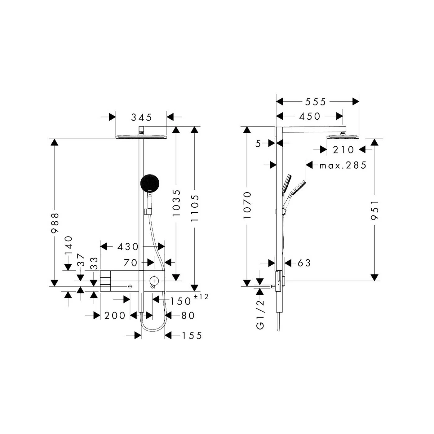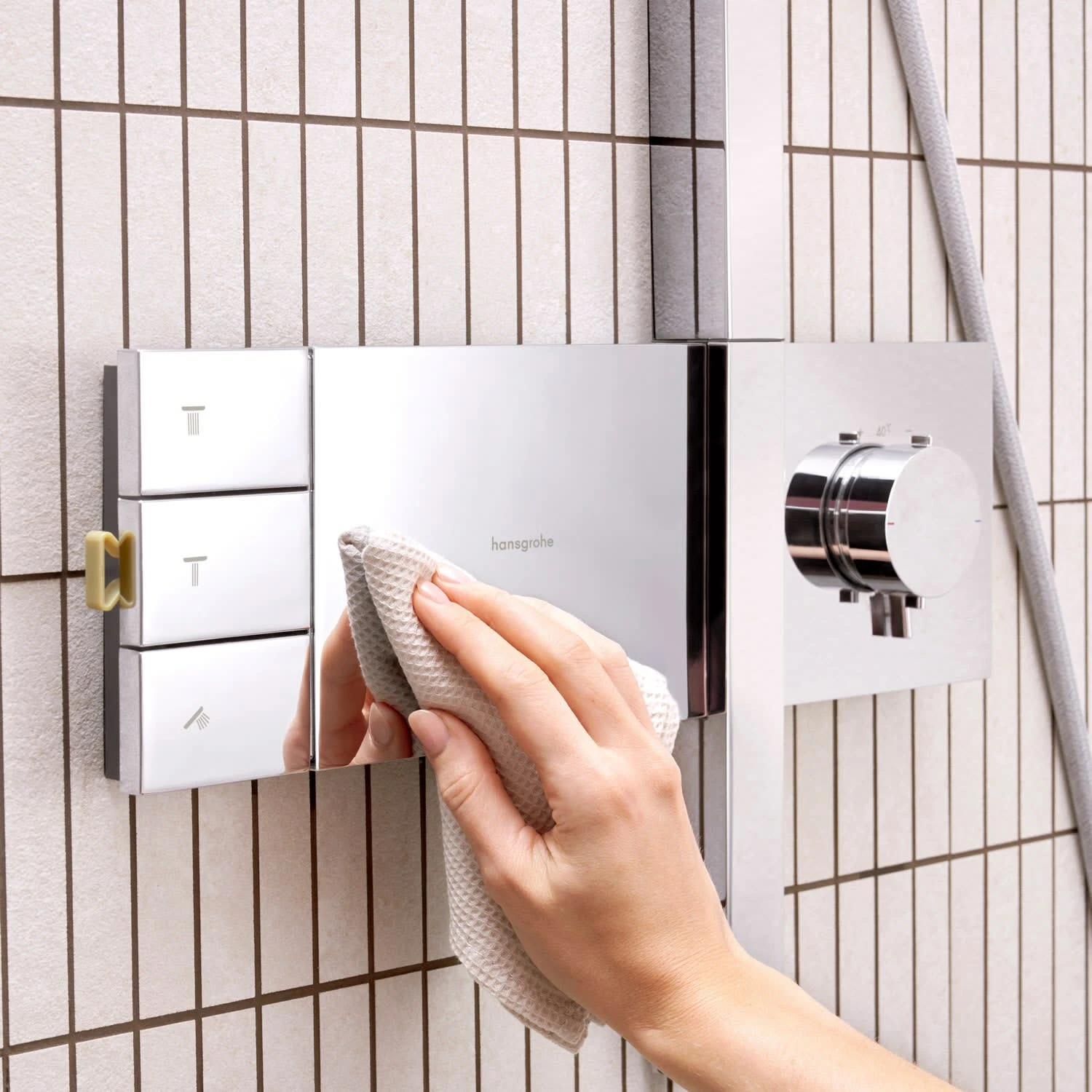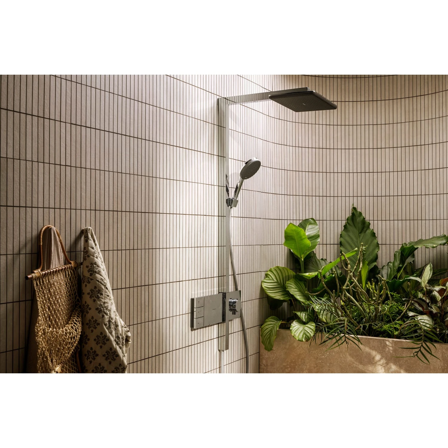 Begeisterung – neu komponiert. Raindance Alive Q 210/340 EcoSmart Duschsystem mit Thermostat (2 Strahlarten) Ankommen und aufatmen! Mit hansgrohe Raindance Alive Q 210/340 EcoSmart (2 Strahlarten) haben Sie gefunden, was Sie suchen. Ein harmonisch aufeinander abgestimmtes Duschsystem für mehr Geborgenheit, Entspannung und Erfrischung. Ein erster Blick enthüllt das Besondere. Inspiriert von einer Symbiose aus Wasser, Mensch und Raum zelebriert Raindance Alive das Lebenselixier. Und es schenkt Ihnen etwas, das noch kostbarer als Wasser ist: Zeit für sich selbst. Vertrauter Name. Vollkommen neues Gefühl Meisterliches Design: ikonisch und zeitlos überdauert es kurzlebige Trends. Entworfen in Zusammenarbeit mit dem renommierten Studio Phoenix Wohlfühlatmosphäre: Die moderne Gestaltung des Duschkopfs strahlt Wärme aus und macht das Badezimmer wohnlicher Große Auswahl: Je nach Stimmung wählen Sie mit einem Tastendruck (Select) zwischen drei Strahlarten an der Handbrause. Die Kopfbrause verwöhnt mit den beliebten Strahlarten Rain oder PowderRain Verantwortung für morgen? Mit Vergnügen! Die EcoSmart-Technologie von hansgrohe verringert den Wasserverbrauch mit einem flexiblen Durchflussbegrenzer auf max. 8 l/min (3 bar) – ohne Einbußen beim Duschkomfort Weitere Besonderheiten Unbeschwert duschen: Das Thermostat hält Ihre Wunschtemperatur gleichmäßig ein und schützt vor zu heißem Wasser Auch für kalkhaltiges Wasser geeignet: Die eloxierte Abdeckung lässt sich leicht abnehmen und reinigen Skulpturales Design – einfach eingebaut: Ihr hansgrohe Duschsystem wird von außen montiert (Aufputz). Die Wand bleibt unversehrt Markenqualität: 5 Jahre freiwillige Herstellergarantie und ausgesuchte Materialien bewahren das Besondere für lange Zeit Eigenschaften: Duschvergnügen: Extra großer Duschkopf (21 x 34 cm), der den ganzen Körper in wohlig warmes Wasser einhüllt Wohlfühlatmosphäre: Die Mesh-Abdeckung strahlt Wärme aus und macht das Badezimmer wohnlicher Zeitlos schön: Glänzendes Chrom und eine Strahlscheibe in Graphit schaffen ein faszinierendes Design Mit zwei traumhaften Strahlarten: hansgrohe Rain und PowderRain Schenkt neue Energie: Die Strahlart Rain erfrischt mit kräftigem Brauseregen PowderRain: Verwöhnt mit tausenden mikrofeinen Tropfen wie ein sanfter Sommerregen *EcoSmart: Benötigt dank eines flexiblen Durchflussbegrenzers max. 8 l/min – ohne Einbußen beim Duschkomfort Einfach eingebaut: Mitgelieferte S-Anschlüsse werden auf den Wasserauslass geschraubt – die Wand bleibt unversehrt Wasser an – Alltag aus: Die Thermostatfunktion verwöhnt mit einer gleichmäßigen Wassertemperatur Mehr Komfort auf Knopfdruck: Mit der Select-Taste von hansgrohe lässt sich das Wasser schnell an- und abstellen Auf Wunsch Wasser sparen: Die Wassermenge lässt sich individuell einstellen (Water Flow Control) Die Lösung gegen Kalk: Flexible Silikondüsen unter der Abdeckung lassen sich leicht abwischen (QuickClean) 5 Jahre freiwillige Herstellergarantie auf ein Produkt, das nach höchsten Qualitätsstandards gefertigt wurde In allen Bestandteilen sind Premium-Materialien verbaut – für mehr Sicherheit und Nachhaltigkeit im Haushalt hansgrohe seit 1901 – die Premium-Marke für zuverlässige Bad- und Küchenprodukte Lieferumfang: Rosetten S-Anschlüsse Showerpipe mit Thermostat Befestigungsmaterial Montageanleitung