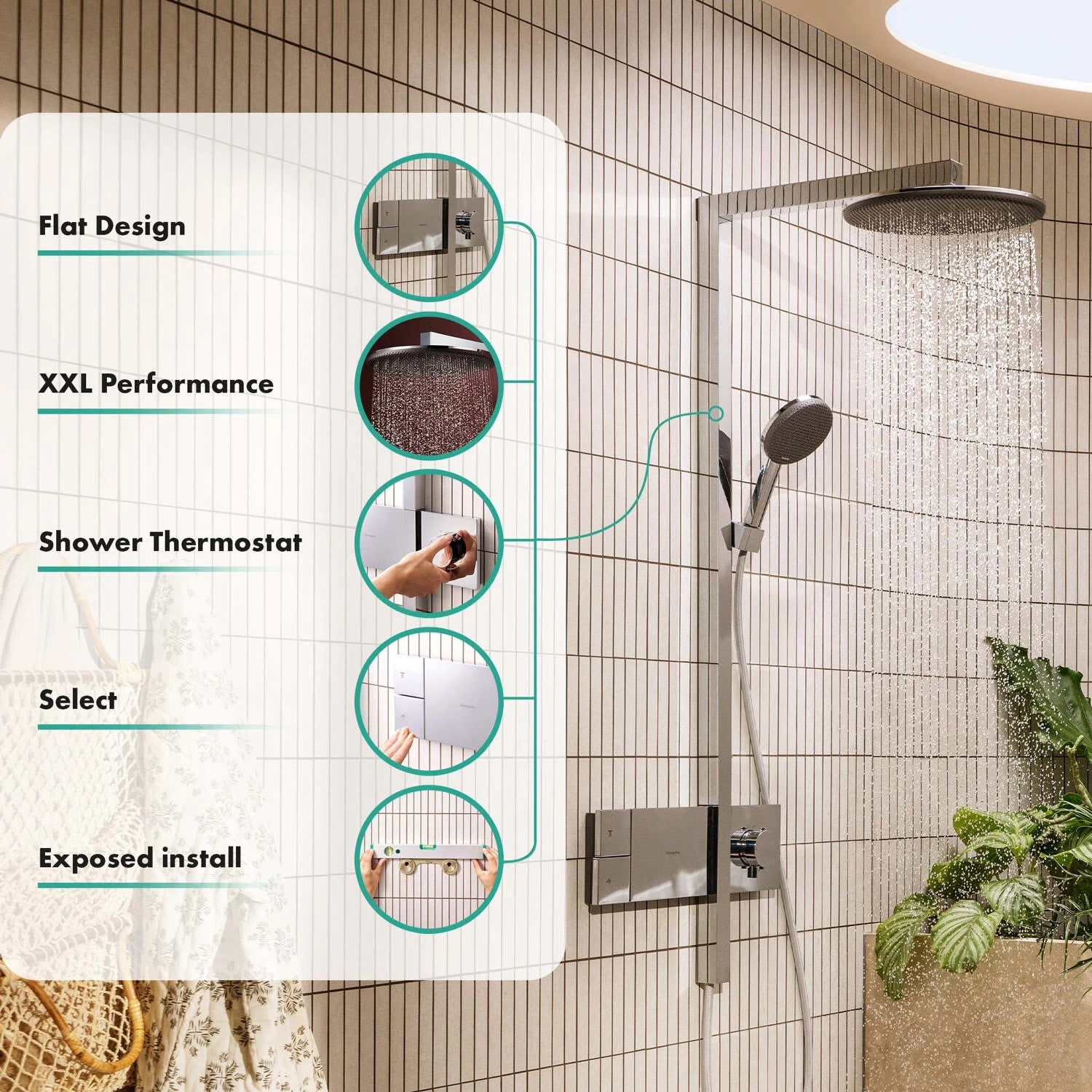 Begeisterung – neu komponiert. Raindance Alive S 300 Duschsystem mit Thermostat (1 Strahlart) Ankommen und aufatmen! Mit hansgrohe Raindance Alive S 300 (1 Strahlart) haben Sie gefunden, was Sie suchen. Ein harmonisch aufeinander abgestimmtes Duschsystem für mehr Geborgenheit, Entspannung und Erfrischung. Ein erster Blick enthüllt das Besondere. Inspiriert von einer Symbiose aus Wasser, Mensch und Raum zelebriert Raindance Alive das Lebenselixier. Und es schenkt Ihnen etwas, das noch kostbarer als Wasser ist: Zeit für sich selbst. Vertrauter Name. Vollkommen neues Gefühl Belebende Erfahrung: hansgrohe Raindance Alive bietet extra großes Duschvergnügen voller Wohlbehagen und Komfort Meisterliches Design: ikonisch und zeitlos überdauert es kurzlebige Trends. Entworfen in Zusammenarbeit mit dem renommierten Studio Phoenix Wohlfühlatmosphäre: Die moderne Gestaltung des Duschkopfs strahlt Wärme aus und macht das Badezimmer wohnlicher Große Auswahl: Je nach Stimmung wählen Sie mit einem Tastendruck (Select) zwischen drei Strahlarten an der Handbrause. Die Kopfbrause verwöhnt mit der Strahlart RainAir – je nach Vorliebe können Sie alternativ auch hansgrohe PowderRain voreinstellen Weitere Besonderheiten Unbeschwert duschen: Das Thermostat hält Ihre Wunschtemperatur gleichmäßig ein und schützt vor zu heißem Wasser Auch für kalkhaltiges Wasser geeignet: Die eloxierte Abdeckung lässt sich leicht abnehmen und reinigen. Darunter verborgene, flexible Düsen werden durch Abwischen von Rückständen befreit Skulpturales Design – einfach eingebaut: Ihr hansgrohe Duschsystem wird von außen montiert (Aufputz). Die Wand bleibt unversehrt Markenqualität: 5 Jahre freiwillige Herstellergarantie und ausgesuchte Materialien bewahren das Besondere für lange Zeit Eigenschaften: Duschvergnügen: Extra großer Duschkopf (Ø 30 cm), der den ganzen Körper in wohlig warmes Wasser einhüllt Wohlfühlatmosphäre: Die Mesh-Abdeckung strahlt Wärme aus und macht das Badezimmer wohnlicher Zeitlos schön: Glänzendes Chrom und eine Strahlscheibe in Graphit schaffen ein faszinierendes Design Wahlmöglichkeit: Verwöhnt ab Werk mit RainAir. Ein Wechsel zu hansgrohe PowderRain ist jederzeit möglich hansgrohe Regendusche: Die Strahlart RainAir umhüllt den Körper mit samtweichen Wassertropfen Wasser an – Alltag aus: Die Thermostatfunktion verwöhnt mit einer gleichmäßigen Wassertemperatur Einfach eingebaut: Mitgelieferte S-Anschlüsse werden auf den Wasserauslass geschraubt – die Wand bleibt unversehrt Mehr Komfort auf Knopfdruck: Mit der Select-Taste von hansgrohe lässt sich das Wasser schnell an- und abstellen Auf Wunsch Wasser sparen: Die Wassermenge lässt sich individuell einstellen (Water Flow Control) Die Lösung gegen Kalk: Flexible Silikondüsen unter der Abdeckung lassen sich leicht abwischen (QuickClean) Erstmals in einer Handbrause: die beiden hansgrohe Strahlarten RainAir und PowderRain. Ergänzt von einem Massagestrahl 5 Jahre freiwillige Herstellergarantie auf ein Produkt, das nach höchsten Qualitätsstandards gefertigt wurde In allen Bestandteilen sind Premium-Materialien verbaut – für mehr Sicherheit und Nachhaltigkeit im Haushalt hansgrohe seit 1901 – die Premium-Marke für zuverlässige Bad- und Küchenprodukte Lieferumfang: Rosetten S-Anschlüsse Showerpipe mit Thermostat Befestigungsmaterial Montageanleitung