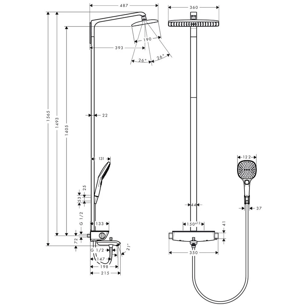 Eigenschaften: Besteht aus: Kopfbrause, Handbrause, Wannenthermostat, Brauseschlauch, Brausehalter Kopfbrause Raindance E 360 Air Brausekopfgröße: 360 x 190 mm Kopfbrause im Winkel verstellbar Ablage aus Sicherheitsglas Strahlart: RainAir Durchflussmenge RainAir Strahl (bei 3 bar): 17 l/min Betriebsdruck: min. 1,3 bar/max. 10 bar vollverchromte Strahlscheibe Brausearmlänge: 380 mm Thermostat Ecostat Select Durchflussmenge Wanneneinlauf: 20 l/min Oberfläche Ablage: chrom oder weiß isolierte Wasserführung Sicherheitssperre bei 40° C einstellbare Heißwasserbegrenzung Verbraucheransteuerung durch Drehen Montageart: Aufputzinstallation Anschlussgröße DN15 Anschlussgewinde R ½ Stichmaß 150 ± 12 mm bei Montage auf bestehenden R ¾ Anschluss wird der Adapter # 02026000 benötigt Bestehend aus: Brausehalter Porter S (# 28331000) Brauseschlauch 160 cm (# 28276000) Handbrause 120 3jet (# 26520000)