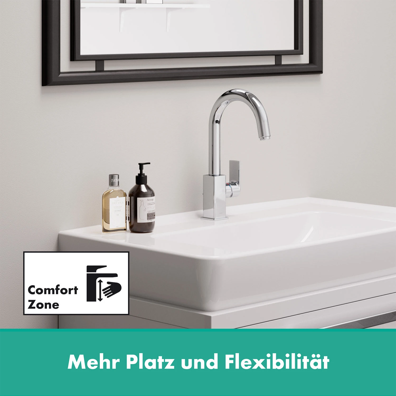 Eigenschaften: starkes Design fürs kleine Budget: Vernis Shape Armaturen begeistern mit einem spannenden Mix aus Kanten und Rundungen mehr Bewegungsfreiheit: der sehr große Abstand zwischen Auslauf und Becken bietet viel Raum für eine komfortable Nutzung (ComfortZone 200) mit Schwenkauslauf für komfortables Haarewaschen oder Befüllen von Gefäßen am Waschbecken (120 Grad) diese Armatur reichert Wasser mit Luft an – für einen vollen Wasserstrahl, der weniger spritzt (AirPower) bewährt: die mitgelieferte Zugstangen-Ablaufgarnitur (?) Zugstangen-Ablaufgarnitur Excenter-Garnitur ist der Ablauf unten im Waschbecken. lässt sich bequem mit einer Hand öffnen und schließen einfache Installation: die Armatur wird über flexible Anschlussschläuche (G 3/8) mit den Wasseranschlüssen verbunden (Größe: DN15) besonders langlebig: ausgestattet mit hochwertigem, leichtgängigem Keramikmischsystem von hansgrohe für Durchlauferhitzer geeignet: diese Armatur ist vielseitig einsetzbar glänzender Auftritt: die brillante, leicht zu reinigende Chromoberfläche überzeugt mit dauerhaftem Glanz Lieferumfang: Einhebel-Waschtischmischer, Anschlussschläuche, Schaftbefestigung, Montageanleitung in allen Bestandteilen sind Premium-Materialien verbaut – für mehr Sicherheit und Nachhaltigkeit im Haushalt hansgrohe seit 1901 – die Premium-Marke für zuverlässige Bad- und Küchenprodukte 5 Jahre freiwillige Herstellergarantie auf ein Produkt, das nach höchsten Qualitätsstandards gefertigt wurde