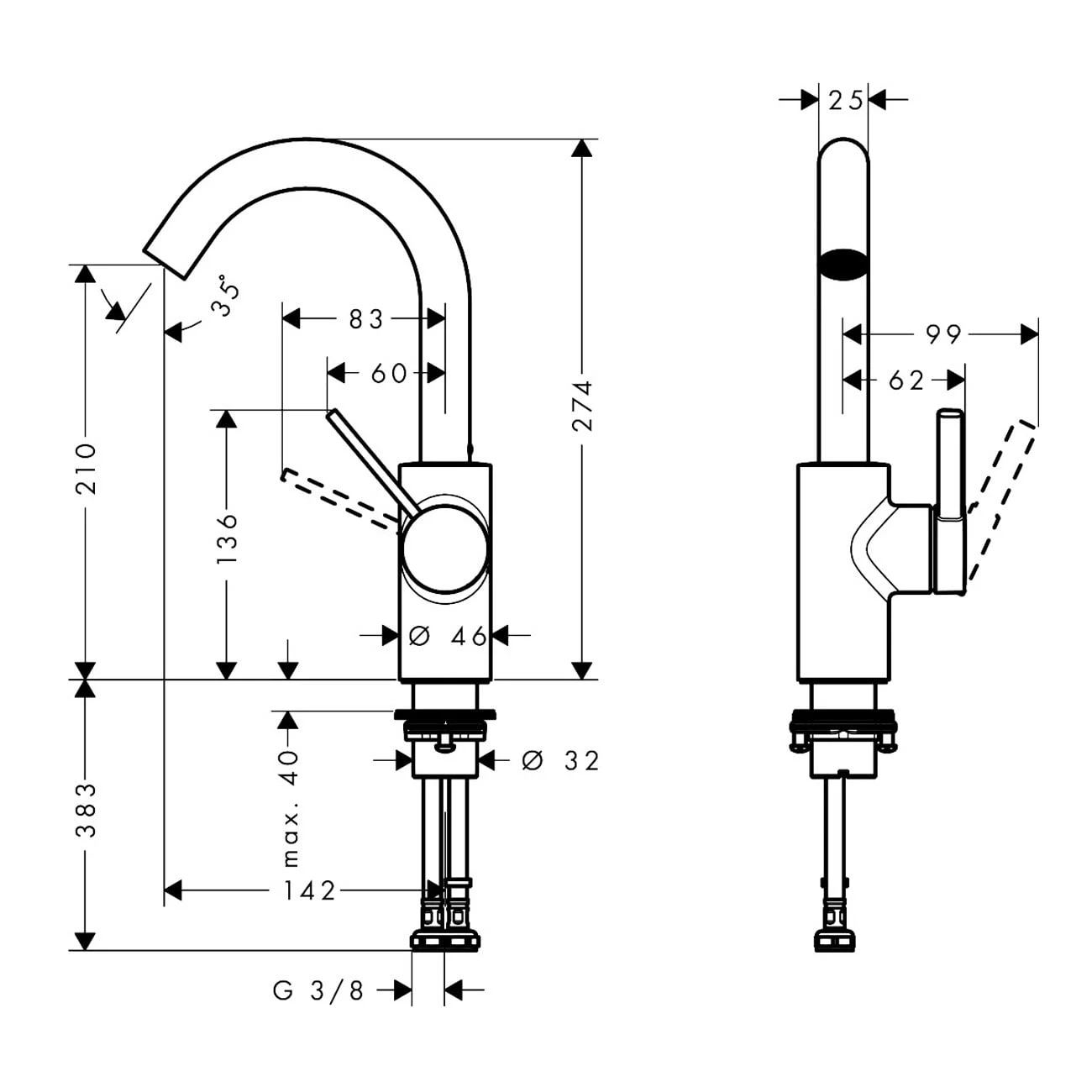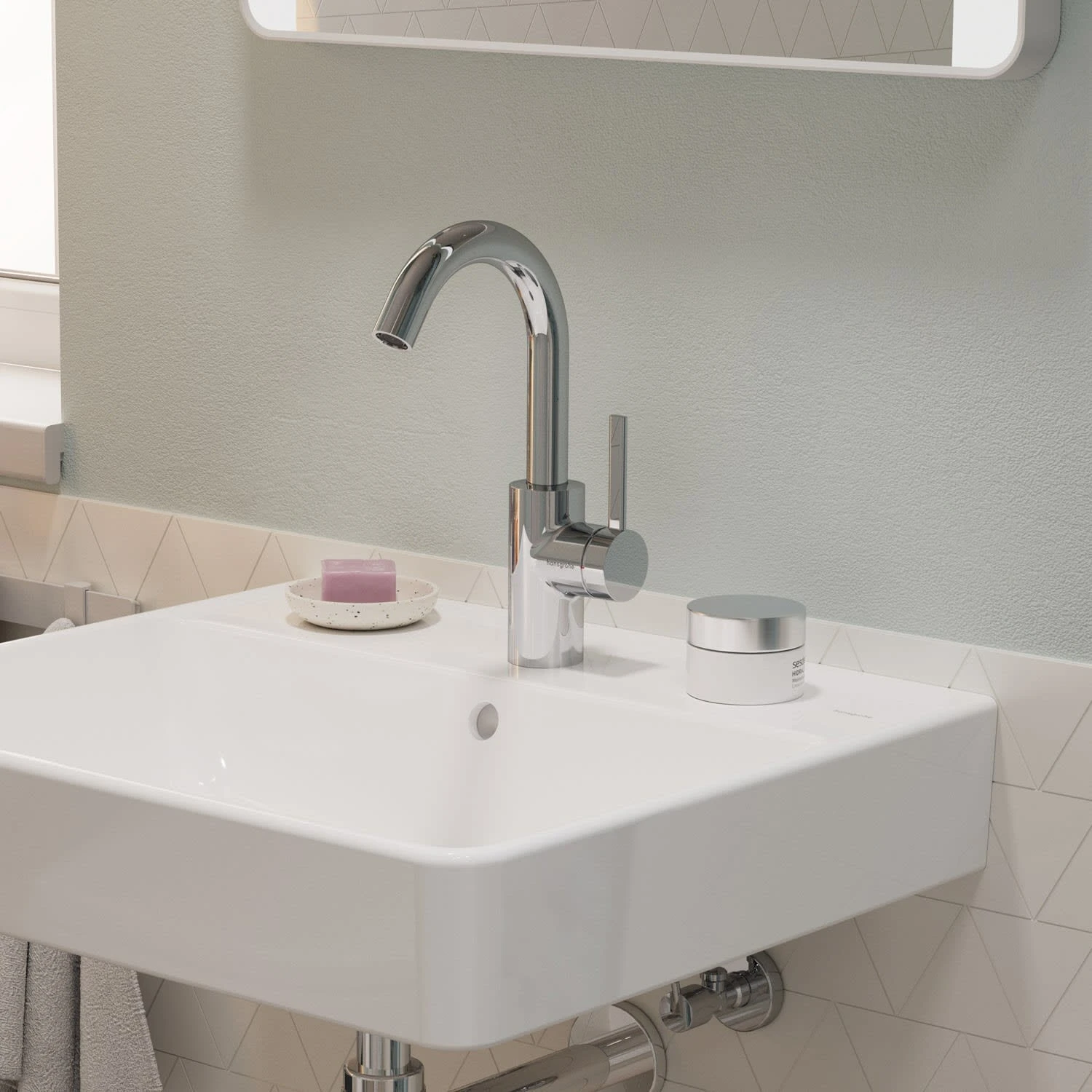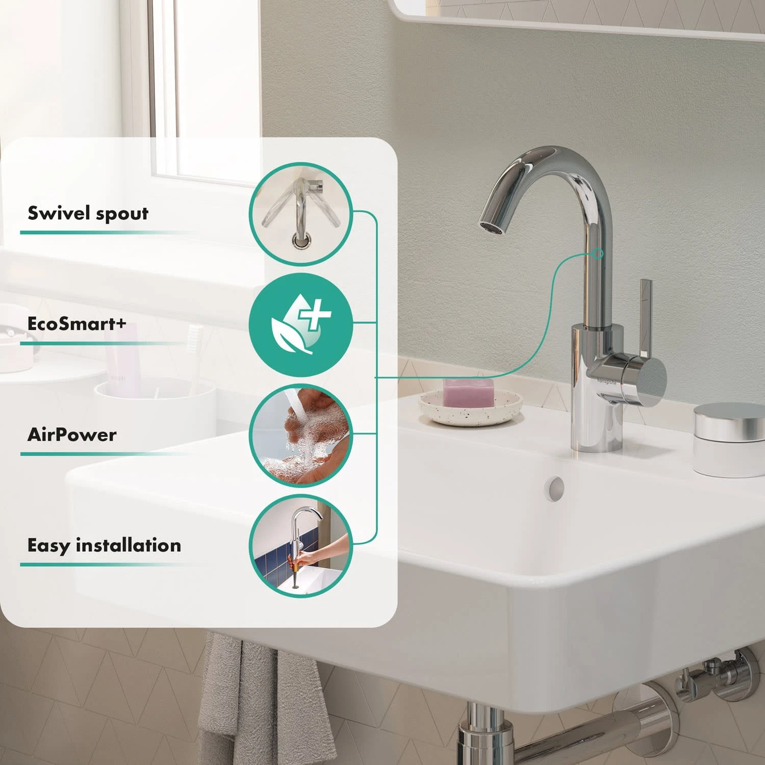 Ihr Ruhepol: wassersparende Waschtischarmatur mit Schwenkauslauf Badmodernisierung leicht gemacht – mit der hochwertigen Design-Armatur hansgrohe Zesis S 210 mit Schwenkauslauf . In einer lauten Welt braucht es ein Design für leise Momente. Hier bildet hansgrohe Zesis S den perfekten Mittelpunkt für Ihre Oase der Erholung: Die geometrische Gestaltung dieser Armaturenlinie wurde auf das Wesentliche reduziert und strahlt Ruhe aus. So schafft die zeitlose Formensprache ein gelungenes Badambiente, das über viele Jahre seinen eindrucksvollen Charakter bewahren wird. Tipp: Kombinieren Sie die Waschtischarmatur mit weiteren Produkten von hansgrohe, um ein harmonisches Gesamtbad zu gestalten. Moderne Funktionen zum attraktiven Preis Mit Schwenkauslauf: Für komfortables Haarewaschen oder Befüllen von Gefäßen am Waschbecken (120° oder 360°) Leicht zu reinigen: Vom runden Auslauf perlt Wasser einfach ab, Kalkflecken werden verringert Zeitgemäß: EcoSmart+ nutzt nur 4 l/min (bei 3 bar) und damit 20 % weniger Wasser als hansgrohe EcoSmart Für einen vollen Wasserstrahl, der weniger spritzt, reichert diese Armatur Wasser mit Luft an (AirPower) Weitere Besonderheiten Leichtgängiges Keramikmischsystem von hansgrohe Vielseitig: Auch für Durchlauferhitzer geeignet Nachkaufgarantie: Ersatzteile sind bis zu 15 Jahre nach Auslaufen der Linie verfügbar Eigenschaften: Zesis S: Ein Design, das zum Entspannen einlädt. Auch beim Preis *EcoSmart+: Benötigt dank eines flexiblen Durchflussbegrenzers max. 4 l/min (3 bar) Leicht zu reinigen: dank des puristischen Designs ist die Armatur schnell wieder sauber Einfach eingebaut: Die Armatur wird über flexible Schläuche mit den Wasseranschlüssen verbunden (G 3/8) Glänzender Auftritt: Die brillante Chromoberfläche überzeugt mit dauerhaftem Glanz Markenqualität: ausgestattet mit hochwertigem, leichtgängigem Keramikmischsystem von hansgrohe Auch für Durchlauferhitzer geeignet: Diese Armatur lässt sich vielseitig einsetzen 5 Jahre freiwillige Herstellergarantie auf ein Produkt, das nach höchsten Qualitätsstandards gefertigt wurde Lieferumfang: Einhebel-Waschtischmischer, Anschlussschläuche, Schaftbefestigung, Montageanleitung In allen Bestandteilen sind Premium-Materialien verbaut – für mehr Sicherheit und Nachhaltigkeit im Haushalt hansgrohe seit 1901 – die Premium-Marke für zuverlässige Bad- und Küchenprodukte