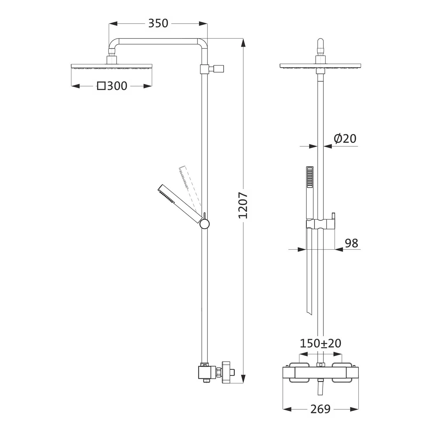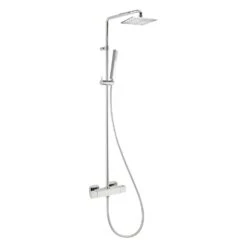 Eigenschaften: Gesamthöhe 120,7 cm (kürzbar) Ausladung Brausearm 35 cm (nicht schwenkbar) eckige Thermostatbatterie mit Ab-/Umstellventil LOGIC-Easyclean Thermostatkartusche Heißwassersperre 38°C aufsteckbare Rosetten S-Anschlüsse 1/2″ / 3/4″ Slim-Regenbrause 30 cm x 30 cm eckige Stabhandbrause mit Clean-Effect runder Konusgleiter stufenlos höhenverstell- und neigbar Silberflex-Brauseschlauch 1/2″ x 160 cm x 1/2″ mit brauseseitigem Drehkonus mit Befestigungsmaterial zur Aufputz-Wandmontage Durchflussmenge Regenbrause: ca. 10-14 l/min bei 3 bar Durchflussmenge Stabhandbrause: ca. 21 l/min bei 3 bar Oberfläche: chrom