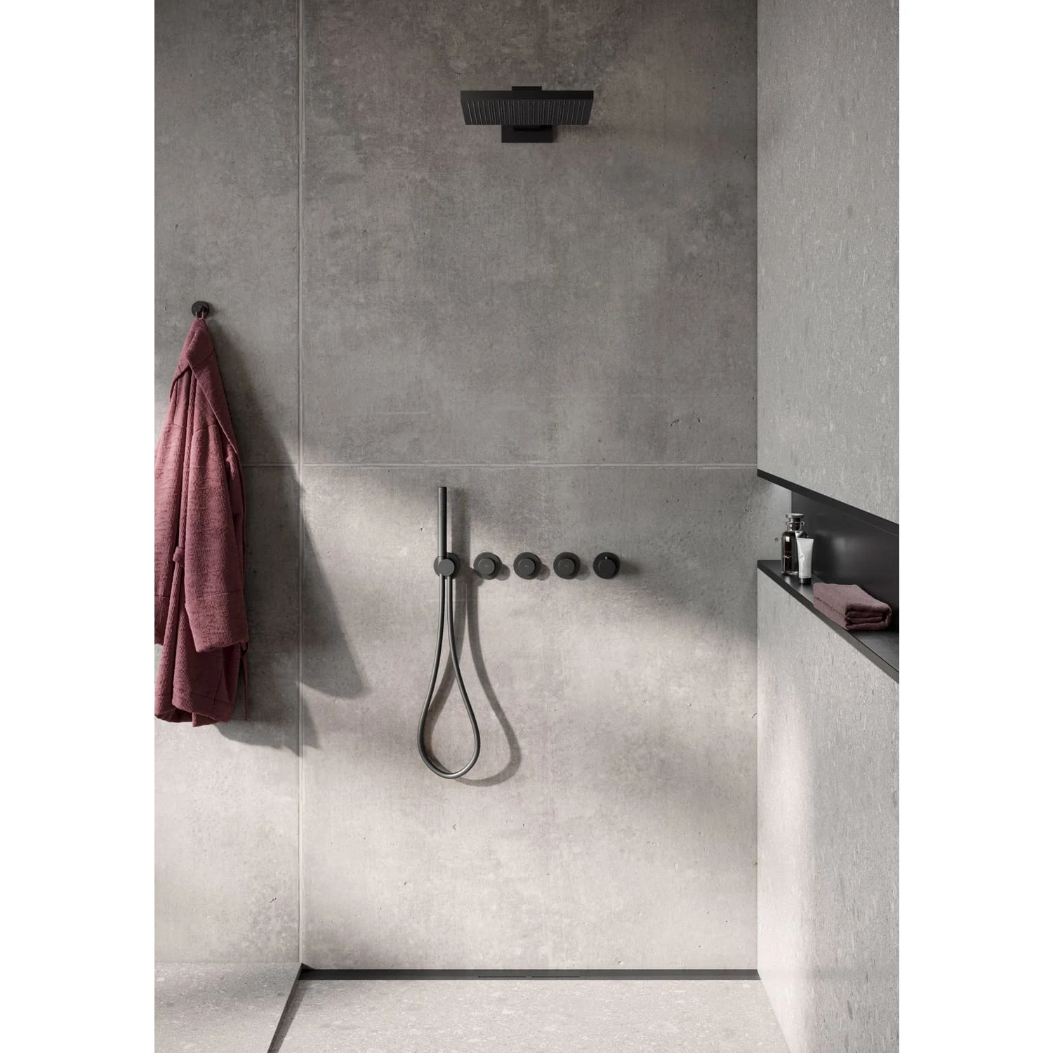 Mit MODUL7 präsentiert Herzbach ein neues und einzigartiges System für hochwertige Badwelten, das sich durch das einheitliche 7 cm Blenden-Design und eine optimale Anpassungsfähigkeit auszeichnen. Das Unterputz-System hat dabei serienmäßig alle abstandsgebenden Elemente mit einem Stichmaß von 10,5 cm bereits integriert. Dadurch gestaltet sich der Einbau nicht nur einfach und mühelos, der Abstand ist auch stets perfekt. Das Ergebnis ist nicht nur funktional, sondern begeistert mit seiner perfekten und zeitlosen Eleganz. Modul7 ist mit der Herzbach Artikelwelt kombinierbar und macht ihr Traumbad möglich. Set bestehend aus: MODUL7 PUSH Thermostat-Einbaukörper für 3 Verbraucher, Art.-Nr. 70.730003.1.09: 1/2″ Anschlussbogen LOGIC-Thermostatkartusche schallentkoppelte Montage Dichtmanschette geeignet für Abdichtung nach DIN 18534 2 Zuläufe unten verwechslungssicher markiert Anschlussgewinde G 3/4″ Einbautiefe 7,7 cm – 9,7 cm MODUL7 PUSH Thermostat-Farbset für 3 Verbraucher, Art.-Nr. 70.703003.1.12: drehbare Thermostatkartusche zur Regelung des Temperaturbereichs von 20° C – 55° C manuell entriegelbare Heißwassersperre bei 38° C als Verbrühschutz Modulblende mit skizzierter Temperaturskala 3 PUSH Mengenventile Start + Stop des Wasserflusses durch Drücken des PUSH Mengenventils leichtgängige und stufenlose Mengenregulierung mit komfortablem 90° Bedienradius Wandanschlussbogen mit Brausehalter und verdecktem Schlauchanschluss Brauseschlauch 150 cm mit Drehkonus Stabhandbrause, 1-strahlig LIVING SPA Regenbrause TWIN FLOW, Art.-Nr. 11.044277.1.12: 30 x 30 cm Strahlart: Regen soft, Regen intensiv mit Befestigungsmaterial zur Aufputz-Wandmontage Clean-Effect Eigenschaften: Montageart: Wandmontage Unterputz Material: Messing Oberfläche: schwarz matt Beschichtung: pulverbeschichtet Mittenabstand Modulblenden 10,5 cm min. Betriebsdruck: 0,5 bar max. Betriebsdruck: 5 bar integrierte Rückflussverhinderer und Schmutzfangsiebe