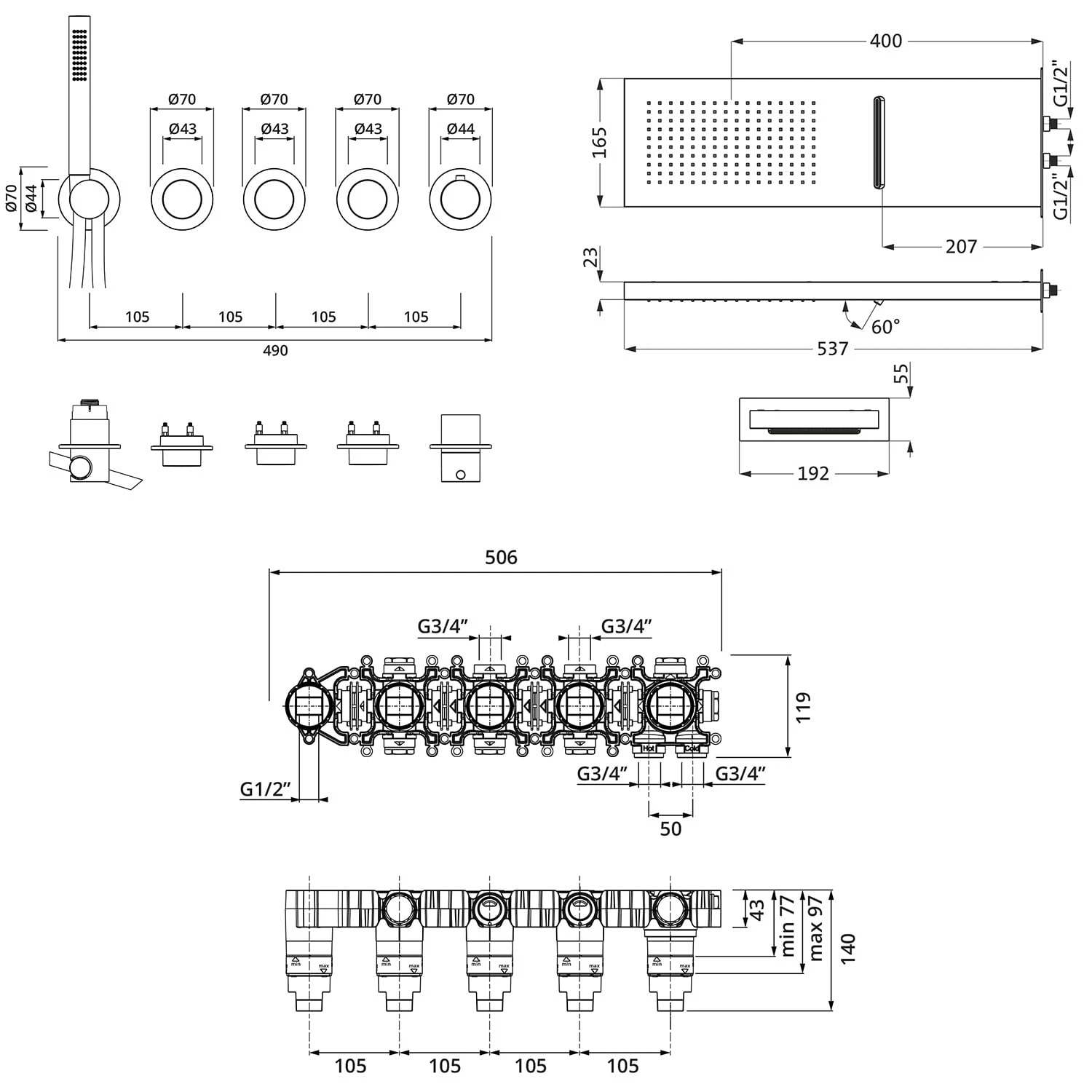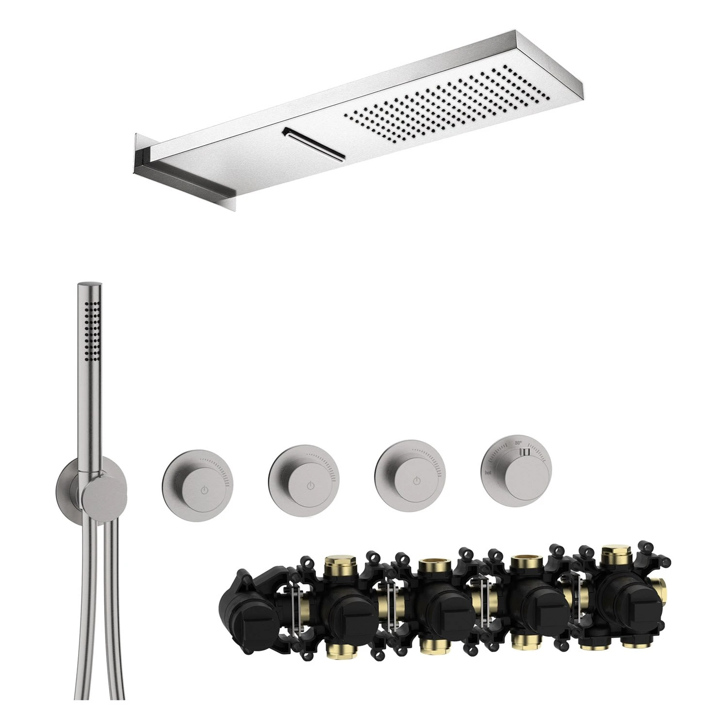 Mit MODUL7 präsentiert Herzbach ein neues und einzigartiges System für hochwertige Badwelten, das sich durch das einheitliche 7 cm Blenden-Design und eine optimale Anpassungsfähigkeit auszeichnen. Das Unterputz-System hat dabei serienmäßig alle abstandsgebenden Elemente mit einem Stichmaß von 10,5 cm bereits integriert. Dadurch gestaltet sich der Einbau nicht nur einfach und mühelos, der Abstand ist auch stets perfekt. Das Ergebnis ist nicht nur funktional, sondern begeistert mit seiner perfekten und zeitlosen Eleganz. Modul7 ist mit der Herzbach Artikelwelt kombinierbar und macht ihr Traumbad möglich. Set bestehend aus: MODUL7 PUSH Thermostat-Einbaukörper für 3 Verbraucher, Art.-Nr. 70.730003.1.09: 1/2″ Anschlussbogen LOGIC-Thermostatkartusche schallentkoppelte Montage Dichtmanschette geeignet für Abdichtung nach DIN 18534 2 Zuläufe unten verwechslungssicher markiert Anschlussgewinde G 3/4″ Einbautiefe 7,7 cm – 9,7 cm MODUL7 PUSH Thermostat-Farbset für 3 Verbraucher, Art.-Nr. 70.703003.1.09: drehbare Thermostatkartusche zur Regelung des Temperaturbereichs von 20° C – 55° C manuell entriegelbare Heißwassersperre bei 38° C als Verbrühschutz Modulblende mit skizzierter Temperaturskala 3 PUSH Mengenventile Start + Stop des Wasserflusses durch Drücken des PUSH Mengenventils leichtgängige und stufenlose Mengenregulierung mit komfortablem 90° Bedienradius Wandanschlussbogen mit Brausehalter und verdecktem Schlauchanschluss Brauseschlauch 150 cm mit Drehkonus Stabhandbrause, 1-strahlig LIVING SPA Regenbrause eckig Multifunktion 2, Art.-Nr. 11.661600.2.09: 53,7 x 16,5 cm Strahlart: Regen, Schwall mit Wandblende und Befestigungsmaterial zur Aufputz-Wandmontage Clean-Effect Eigenschaften: Montageart: Wandmontage Unterputz Material: Edelstahl Oberfläche: Edelstahl matt gebürstet Mittenabstand Modulblenden 10,5 cm min. Betriebsdruck: 0,5 bar max. Betriebsdruck: 5 bar integrierte Rückflussverhinderer und Schmutzfangsiebe
