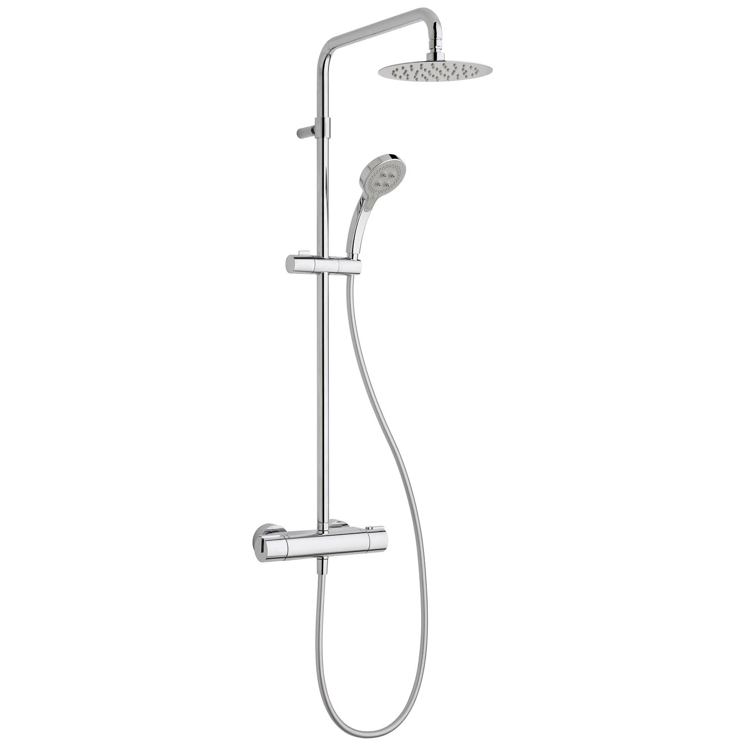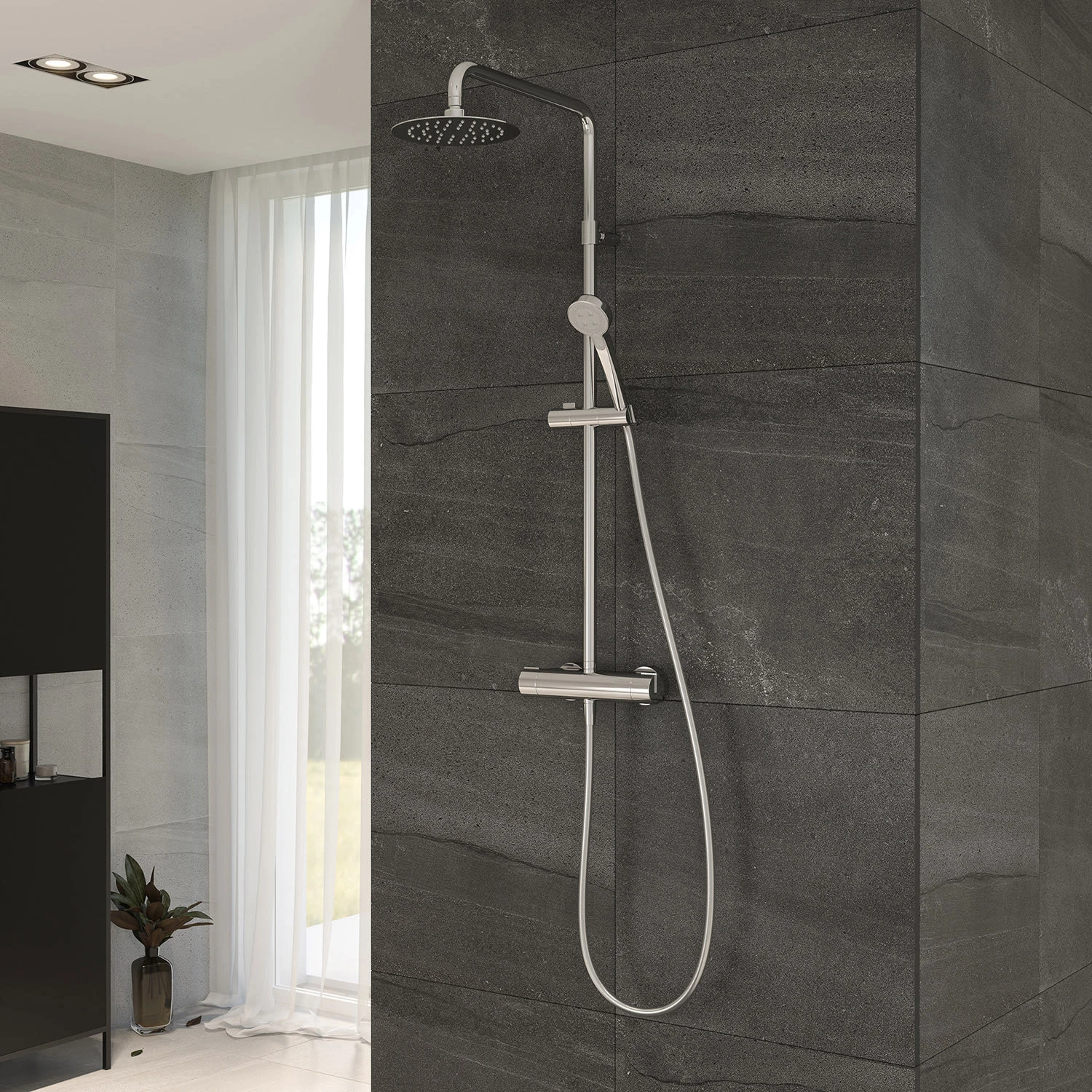 Eigenschaften: Thermostatkartusche mit Temperaturregler, mit Sicherheitssperre bei 38° mit Rückflussverhinderer Kopfbrause Ø 20 cm ultraflaches, schwenkbar Handbrause Ø 9,5 cm, 2 Strahlarten Brauseschlauch 160 cm Durchflussmenge 12 Liter/Min.