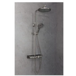 Eigenschaften: Sicherheitsthermostat mit 38 C Sperre Kaltwasser-Ausfallsicherung Inkl. Ruckflussverhinderer Keramische Gleitregler zum Einstellen der Wassermenge Kopfbrause AquaXPro Rund, Ø 25×1,8 cm, schwenk- und hohenverstellbar Designhandbrause AquaXPro Rund mit 3 Strahlarten: Rain, SoftRain unde Massage Antikalk-Noppen Gripoptimierte Funktionselemente fur mehr Bedienkomfort Brauseschlauch 1,5 m mit beidseitiger Verdrehsicherung Hohenverstellbare Halterung an der Brausestange Echtglasablage (ESG) Bei Oberfläche Chrom (02) – Glasfarbe Weiß Bei Oberfläche Gunmetal gebürstet (280) – Glasfarbe schwarz