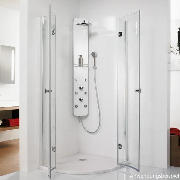 Eigenschaften: mit Kopfbrause superflach ( 0,2 cm hoch ), rund 30 cm Durchmesser Sicherheitsthermostat mit 38° C Sperre 3-Wege-Steuerelement separate Design Handbrause mit 2 Strahlarten: Normalstrahl und Massagestrahl Antikalk- und Verdrehsicherung 6 justierbare Massagedüsen Utensilienablage mit Reling 1/2″ Anschlüsse für Kalt- und Warmwasser inkl. Montagezubehör für Wand- und Eckmontage Korpus Edelstahl poliert Front inkl. Edelglas Beschichtung Gesamthöhe 150 cm Korpusbreite 22 cm Korpustiefe 8 cm