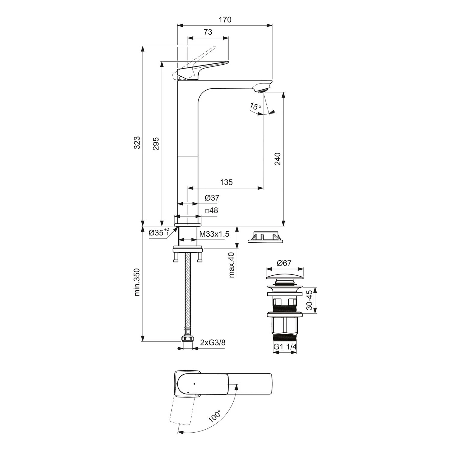 Ceralife C – Modernes Design trifft nachhaltige Funktionalität Die Ceralife C Waschtischarmatur von Ideal Standard vereint modernes Design mit nachhaltiger Funktionalität. Mit ihren klaren, geometrischen Linien und abgerundeten Kanten fügt sie sich perfekt in jedes moderne Badezimmer ein. Die Waschtischarmatur mit verlängertem Sockel und einer Auslaufhöhe von 24 cm sorgt für ein komfortables und bequemes Benutzererlebnis. Die BlueStart-Funktion spart Energie, Wasser und Geld ohne Komfortverlust durch Kaltwasser bei Hebelmittelstellung. Die Armatur verfügt über eine Schaftverschraubung von unten, die eine besonders einfache und schnelle Installation ermöglicht. Mit einem hochwertigen Metall-Push-Open-Ventil, das den Wasserablauf reguliert, ist die Armatur ebenfalls ausgestattet. Die FirmaFlow®-Kartusche überzeugt durch ihre lange Lebensdauer und ihren hohen Komfort. Sie steuert die Wassertemperatur und den Durchfluss präzise und reduziert den Wasserverbrauch gleichzeitig auf effiziente 3,8 Liter pro Minute. So schont die Armatur die Umwelt und Ihren Geldbeutel, ohne dass Sie Kompromisse machen müssen. Eigenschaften: Version: H240, verlängerter Sockel Auslaufhöhe: 24 cm Luftsprudler (sichtbar) Metall-Push-Open Ventil Flexible Anschlussschläuche G3/8 Griff aus Metall mit Rot-/Blau-Markierung Schaftverschraubung von unten BlueStart Kartusche: Ø 2,8 cm FirmaFlow® Kartusche mit keramischen Dichtscheiben Kartuschenschwenkbereich: 100° Heißwassertemperaturbegrenzer Norm: DIN EN 248 Geräuschverhalten DIN 4109: Gruppe 1 Lebensdauer: DIN EN 817 Durchfluss bei 3 bar: 3,8 l/min