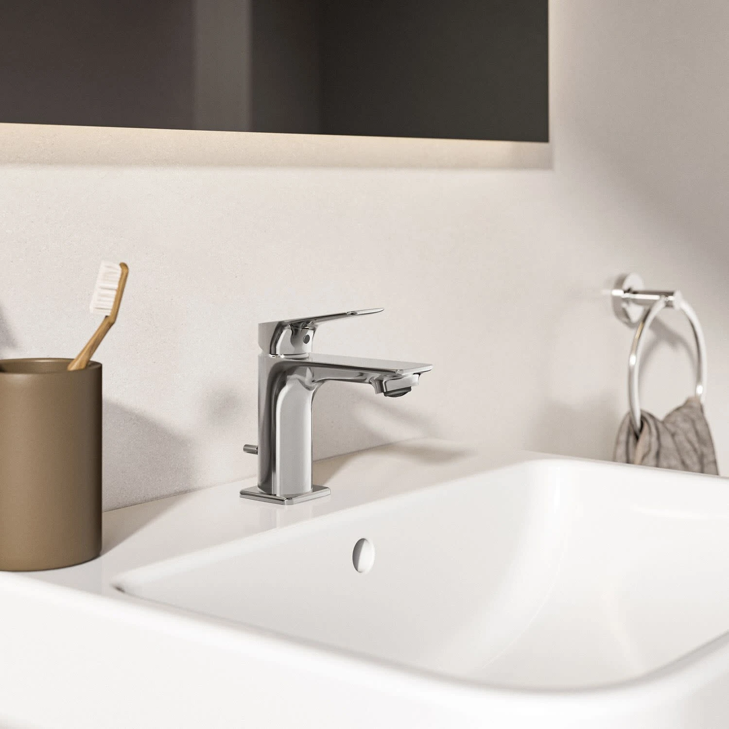 Ceralife C – Modernes Design trifft nachhaltige Funktionalität Die Ceralife C Waschtischarmatur von Ideal Standard vereint modernes Design mit nachhaltiger Funktionalität. Mit ihren klaren, geometrischen Linien und abgerundeten Kanten fügt sie sich perfekt in jedes moderne Badezimmer ein. Die Auslaufhöhe von 7,5 cm sorgt für ein komfortables und bequemes Benutzererlebnis. Die BlueStart-Funktion spart Energie, Wasser und Geld ohne Komfortverlust durch Kaltwasser bei Hebelmittelstellung. Dank des Easy-Fix Schnellmontagesystems lässt sich die Armatur besonders einfach installieren und sorgt für ein schnelles und stressfreies Montageerlebnis. Die Armatur ist mit einer hochwertigen Ablaufgarnitur aus Metall ausgestattet. Die FirmaFlow®-Kartusche überzeugt durch ihre lange Lebensdauer und ihren hohen Komfort. Sie steuert die Wassertemperatur und den Durchfluss präzise und reduziert den Wasserverbrauch gleichzeitig auf effiziente 3,8 Liter pro Minute. So schont die Armatur die Umwelt und Ihren Geldbeutel, ohne dass Sie Kompromisse machen müssen. Eigenschaften: Version: H75 Auslaufhöhe: 7,5 cm Luftsprudler (sichtbar) Metall- Zugstangen-Ablaufgarnitur (?) Zugstangen-Ablaufgarnitur Excenter-Garnitur ist der Ablauf unten im Waschbecken. G1 1/4 Flexible Anschlussschläuche G3/8 Griff aus Metall mit Rot-/Blau-Markierung Schnellmontagesystem Easy-Fix BlueStart Kartusche: Ø 2,8 cm FirmaFlow® Kartusche mit keramischen Dichtscheiben Kartuschenschwenkbereich: 100° Heißwassertemperaturbegrenzer Norm: DIN EN 248 Geräuschverhalten DIN 4109: Gruppe 1 Lebensdauer: DIN EN 817 Durchfluss bei 3 bar: 3,8 l/min