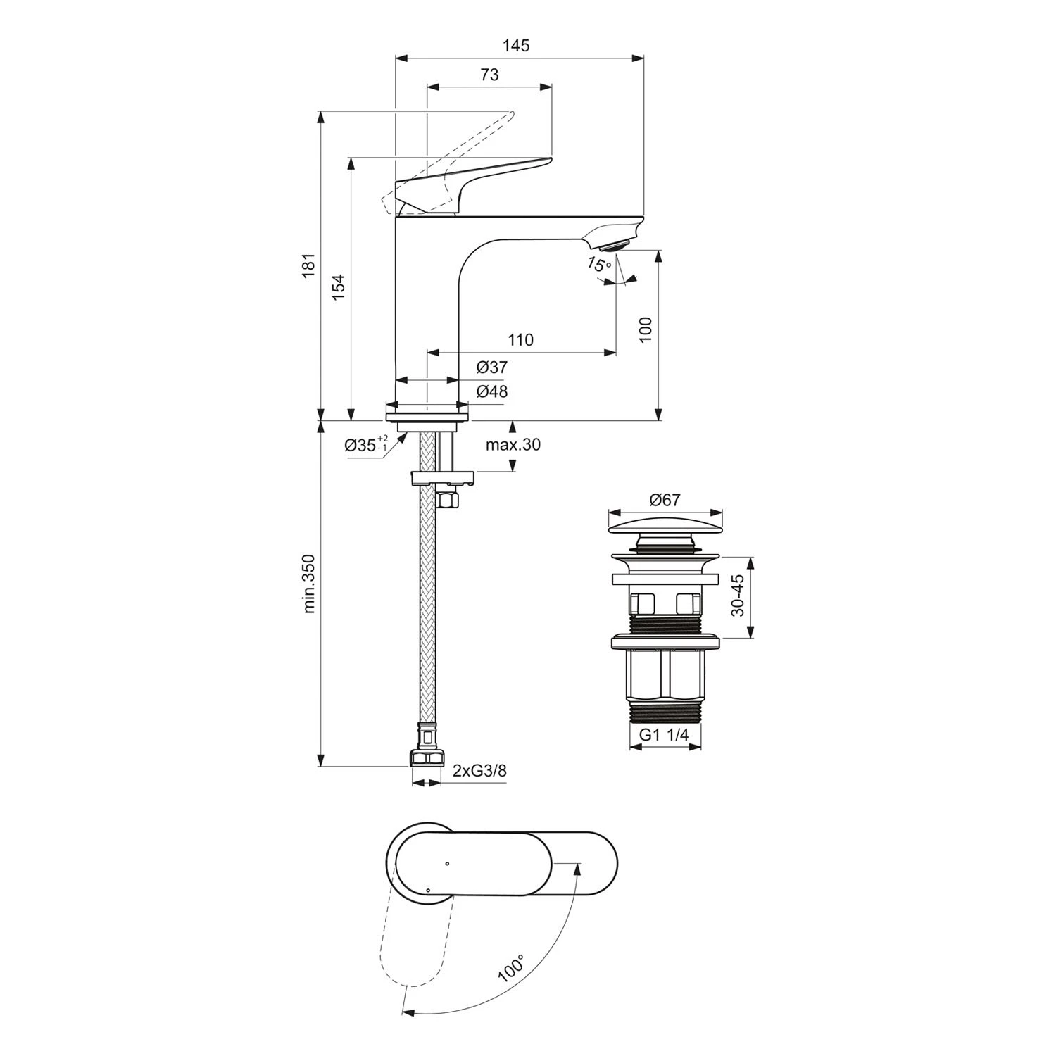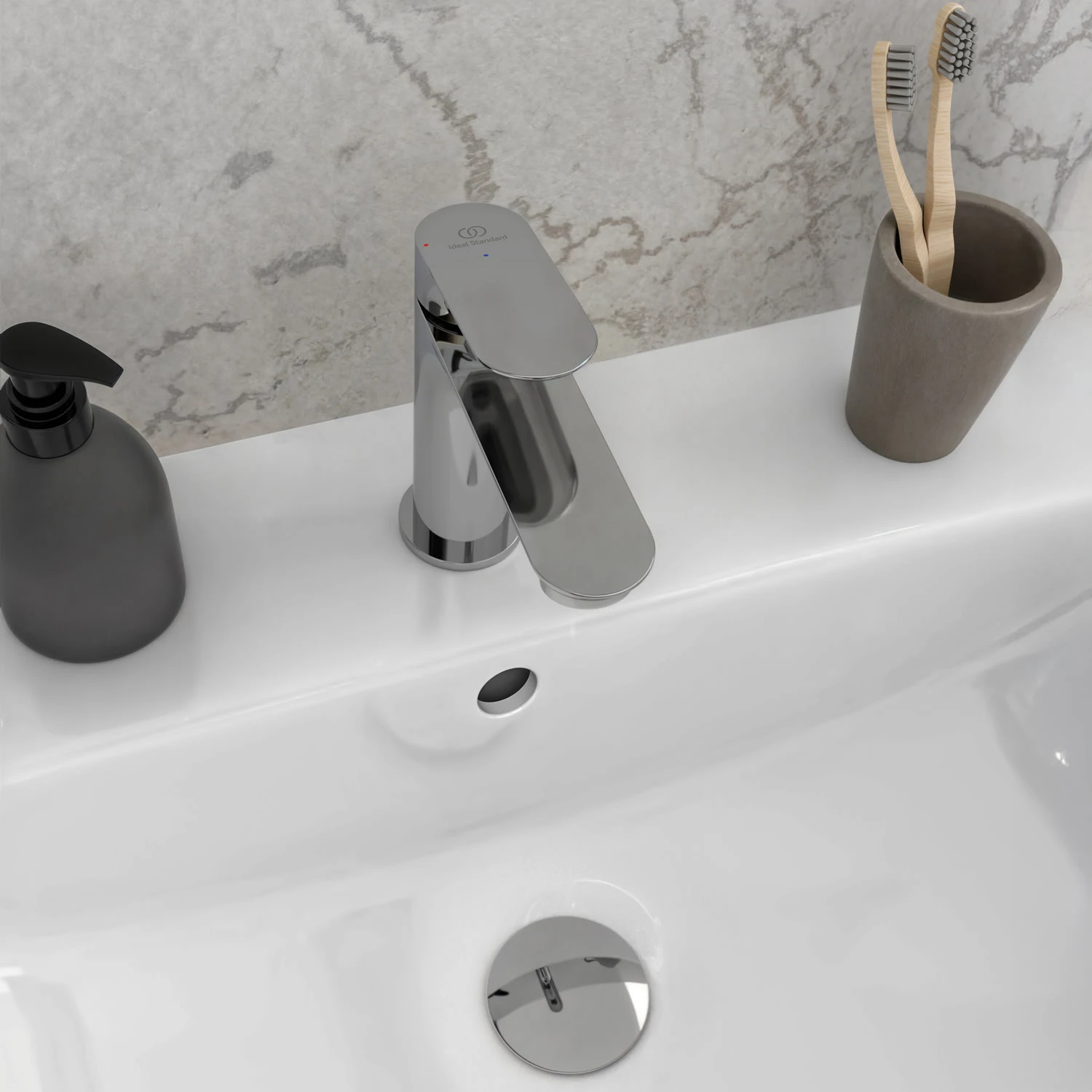 Ceralife O – Modernes Design trifft nachhaltige Funktionalität Die Ceralife O Waschtischarmatur von Ideal Standard vereint modernes Design mit nachhaltiger Funktionalität. Ihre fließenden, organischen Kurven sorgen für eine einzigartige Ästhetik, die jedem Badezimmer einen Hauch von Eleganz verleiht. Die Auslaufhöhe von 10 cm sorgt für ein komfortables und bequemes Benutzererlebnis. Die BlueStart-Funktion spart Energie, Wasser und Geld ohne Komfortverlust durch Kaltwasser bei Hebelmittelstellung. Dank des Easy-Fix Schnellmontagesystems lässt sich die Armatur besonders einfach installieren und sorgt für ein schnelles und stressfreies Montageerlebnis. Die Armatur ist mit einem hochwertigen Metall-Push-Open-Ventil ausgestattet, das den Wasserablauf reguliert. Die FirmaFlow®-Kartusche überzeugt durch ihre lange Lebensdauer und ihren hohen Komfort. Sie steuert die Wassertemperatur und den Durchfluss präzise und reduziert den Wasserverbrauch gleichzeitig auf effiziente 3,8 Liter pro Minute. So schont die Armatur die Umwelt und Ihren Geldbeutel, ohne dass Sie Kompromisse machen müssen. Eigenschaften: Version: H100 Auslaufhöhe: 10 cm Luftsprudler (sichtbar) Metall-Push-Open Ventil Flexible Anschlussschläuche G3/8 Griff aus Metall mit Rot-/Blau-Markierung Schnellmontagesystem Easy-Fix BlueStart Kartusche: Ø 2,8 cm FirmaFlow® Kartusche mit keramischen Dichtscheiben Kartuschenschwenkbereich: 100° Heißwassertemperaturbegrenzer Norm: DIN EN 248 Geräuschverhalten DIN 4109: Gruppe 1 Lebensdauer: DIN EN 817 Durchfluss bei 3 bar: 3,8 l/min