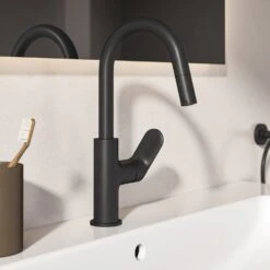 Ceralife O – Modernes Design trifft nachhaltige Funktionalität Die Ceralife O Waschtischarmatur von Ideal Standard vereint modernes Design mit nachhaltiger Funktionalität. Ihre fließenden, organischen Kurven sorgen für eine einzigartige Ästhetik, die jedem Badezimmer einen Hauch von Eleganz verleiht. Mit ihrer Auslaufhöhe von 18 cm und dem 360° Schwenkbereich bietet sie Ihnen maximale Flexibilität und ermöglicht es, bequem alle Bereiche des Waschbeckens zu erreichen. Die Armatur verfügt über eine Schaftverschraubung von unten, die eine besonders einfache und schnelle Installation ermöglicht. Mit einem hochwertigen Metall-Push-Open-Ventil, das den Wasserablauf reguliert, ist die Armatur ebenfalls ausgestattet. Die FirmaFlow®-Kartusche überzeugt durch ihre lange Lebensdauer und ihren hohen Komfort. Sie steuert die Wassertemperatur und den Durchfluss präzise und reduziert den Wasserverbrauch gleichzeitig auf effiziente 3,8 Liter pro Minute. So schont die Armatur die Umwelt und Ihren Geldbeutel, ohne dass Sie Kompromisse machen müssen. Eigenschaften: Version: H200 Auslaufhöhe: 18 cm Luftsprudler (sichtbar) Metall-Push-Open Ventil Flexible Anschlussschläuche G3/8 Griff aus Metall mit Rot-/Blau-Markierung Schaftverschraubung von unten Kartusche: Ø 2,8 cm FirmaFlow® Kartusche mit keramischen Dichtscheiben Kartuschenschwenkbereich: 100° Heißwassertemperaturbegrenzer Schwenkbereich Auslauf: 360° Norm: DIN EN 248 Geräuschverhalten DIN 4109: Gruppe 1 Lebensdauer: DIN EN 817 Durchfluss bei 3 bar: 3,8 l/min