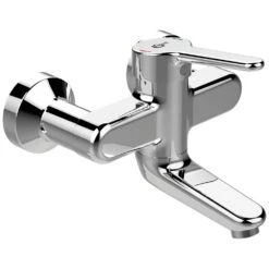 Eigenschaften: Einhebel Wand-Waschtischarmatur DN 15 starrer, selbstentleerender und nickelfreier Auslauf verdeckte absperrbare S-Anschlüsse nickelfrei Rosette mit Wandabdichtung Bedienungshebel aus Metall mit permanenter Rot-/Blau Markierung auf dem Hebel Befestigung von unten (Easy Fix) mit Zentrierdichtung 5 Liter/Minute Durchflusskonstanthalter integrierte Heißwassertemperaturbegrenzung