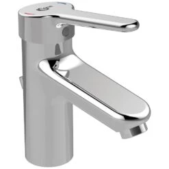 Eigenschaften: Einhebel Waschtischarmatur DN 15 starrer, selbstentleerender und nickelfreier Auslauf mit vandalensicherem Strahlbrecher (Aerosolarm) Zugknopf-Ablaufgarnitur (?) Zugknopf-Ablaufgarnitur Excenter-Garnitur ist der Ablauf unten im Waschbecken. G 1 1/4 aus Metall nickelfreie flexible Anschlussschläuche Bedienungshebel aus Metall mit permanenter Rot-/Blau Markierung auf dem Hebel Befestigung von unten (Easy Fix) mit Zentrierdichtung 8,4 Liter/Minute Durchflusskonstanthalter integrierte Heißwassertemperaturbegrenzung