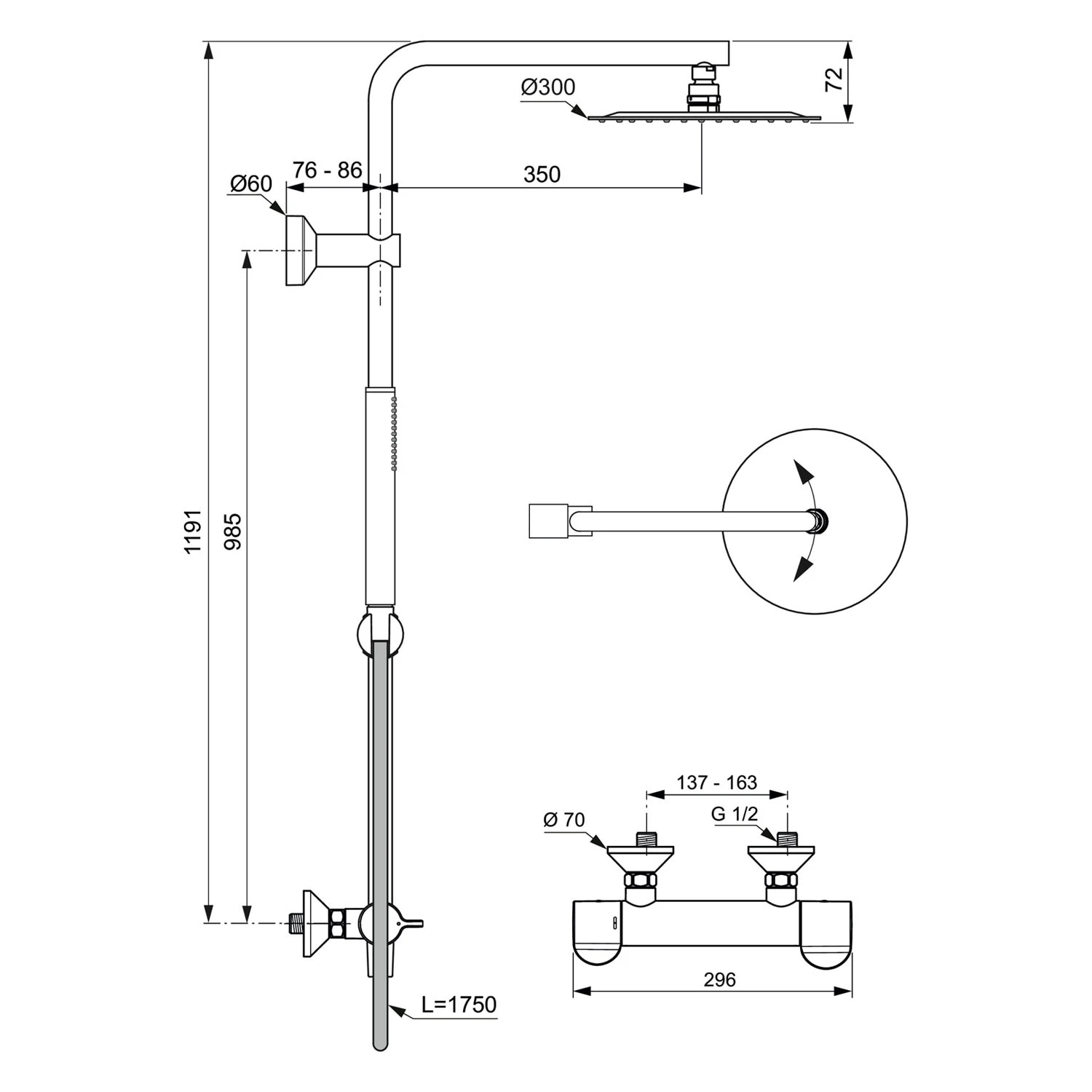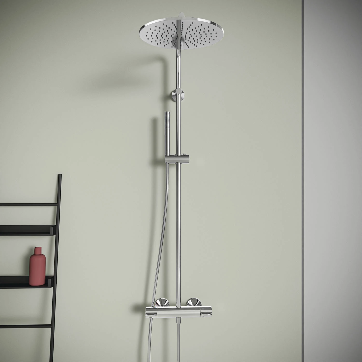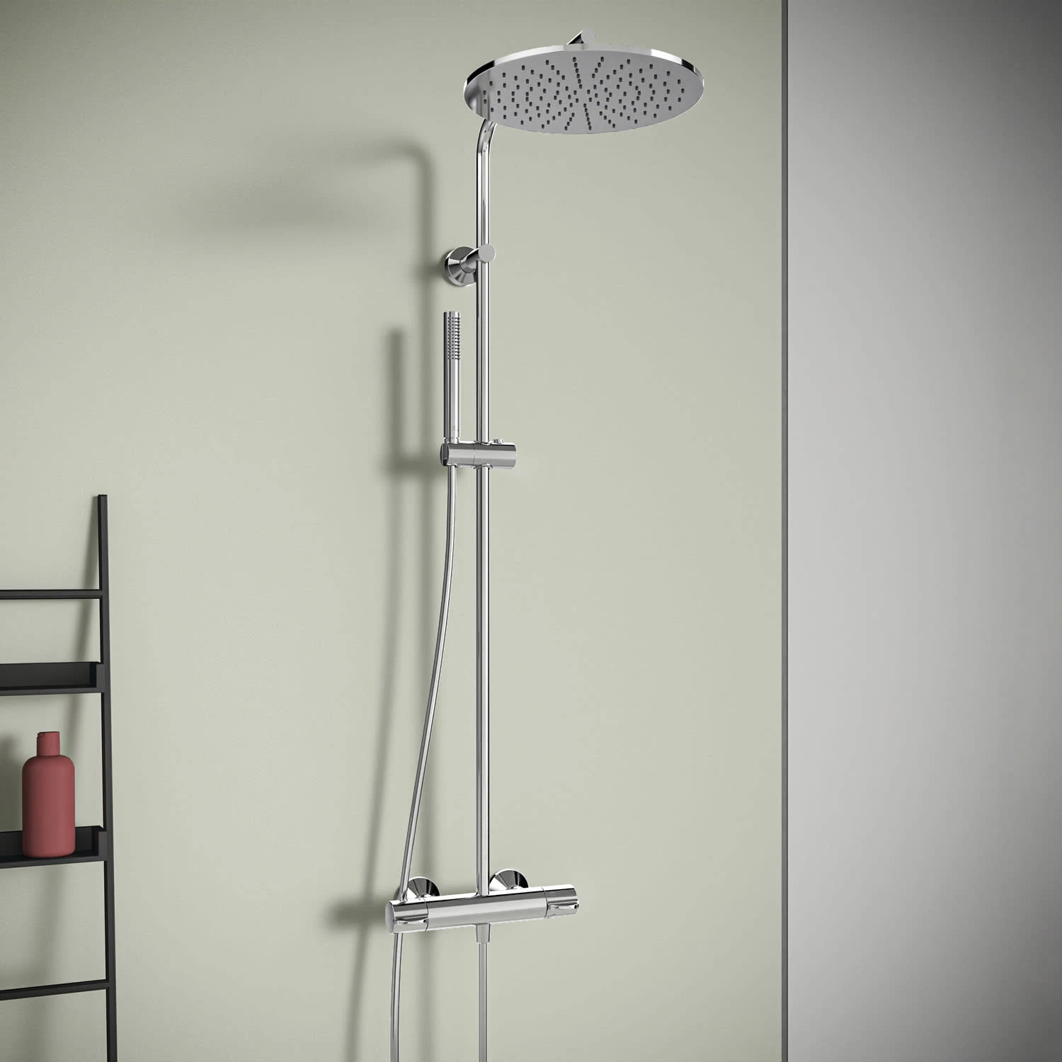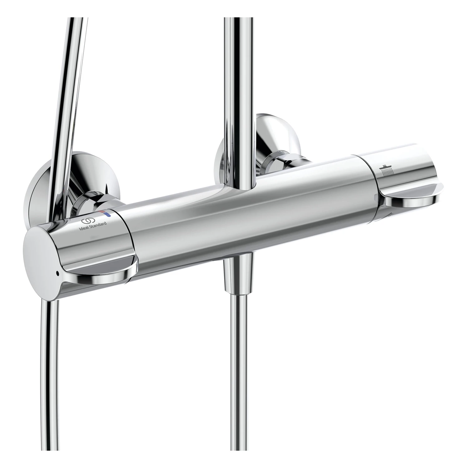 bestehend aus: Brausethermostat: Aufputz DN15 Cool Body S-Anschlüsse (verstellbar) Heißwassertemperatureinstellung mit Verbrühschutz Umschaltung Handbrause/Regenbrause integriert geeignet für thermische Desinfektion Lebensdauer: DIN EN 1111 Kopfbrause: Ø 30 cm Strahlarten: 1 (Regen) mit Kugelgelenk EasyClean Stabhandbrause: Ø 30 cm Strahlarten: 1 EasyClean Brauseschlauch: 175 cm Idealflex Anschluss G1/2 Brausestange: wasserführend inkl. Brausehalter verstellbar mit Druckknopf