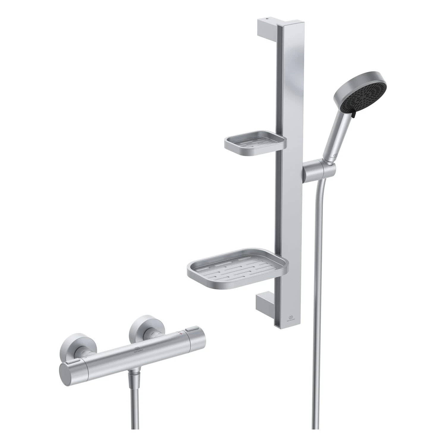 Mit der Ideal Standard Brausekombination aus der Serie Ceratherm Alu+ erwarten Sie wohltuende Duschmomente für pure Entspannung, kombiniert mit umweltfreundlicher Technologie. Hergestellt aus 84 % recyceltem Aluminium und zu 100 % recycelbar, ist es eine nachhaltige Wahl für Ihr Badezimmer. Sie können mit der Handbrause zwischen zwei Funktionen wählen: Entspannen Sie sich mit dem sanften Regen und seinen ultrafeinen Wassertröpfchen oder genießen Sie eine belebende Massage mit dem Massagestrahl. Beide Brausen sind dank der EasyClean-Funktion einfach zu reinigen, Kalkablagerungen an den Silikondüsen lassen sich mit einem leichten Wischen entfernen. Das Brausethermostat verfügt über einen individuell einstellbaren Heißwassertemperaturbegrenzer mit einer Temperatursperre bei 40 °C und die Cool-Body-Funktion verhindert Verbrühungen an der Armaturenoberfläche. Dank der PreciTherm®-Thermostatkartusche bietet die Armatur erstklassige Leistungen in Bezug auf Langlebigkeit und Komfort und steuert mit absoluter Präzision Wassertemperatur und -durchfluss. Dieser wird zudem auf effiziente 8 l/min bei der Handbrause reduziert ohne das Duscherlebnis zu beeinträchtigen. Alu+ Handbrause: 2-Funktion Ø 10 cm Strahlarten: Massage und sanfter Regen Drehumschaltung EasyClean Durchfluss bei 3 bar: 8 l/min Brausestange: 60 cm Brausehalter verstellbar mit Stick-Drehknopf Höhenverstellbare Wandhalterung 2 Ablagen (Einsatz herausnehmbar) Brausehalter und Ablagen lassen sich links / rechts individuell montieren Brauseschlauch: Idealflex 175 cm Anschluss G 1/2 Brausethermostat: Aufputz DN 15 Rückflussverhinderer Cool Body S-Anschluss Griffe aus Kunststoff ECO-Spartaste PreciTherm®-Thermostatkartusche Heißwassertemperaturbegrenzer Heißwassertemperatureinstellung mit Verbrühschutz RV Patrone auf der Warmwasserseite mit integriertem Überdruckventil (Druckentlastung größer 16 bar)