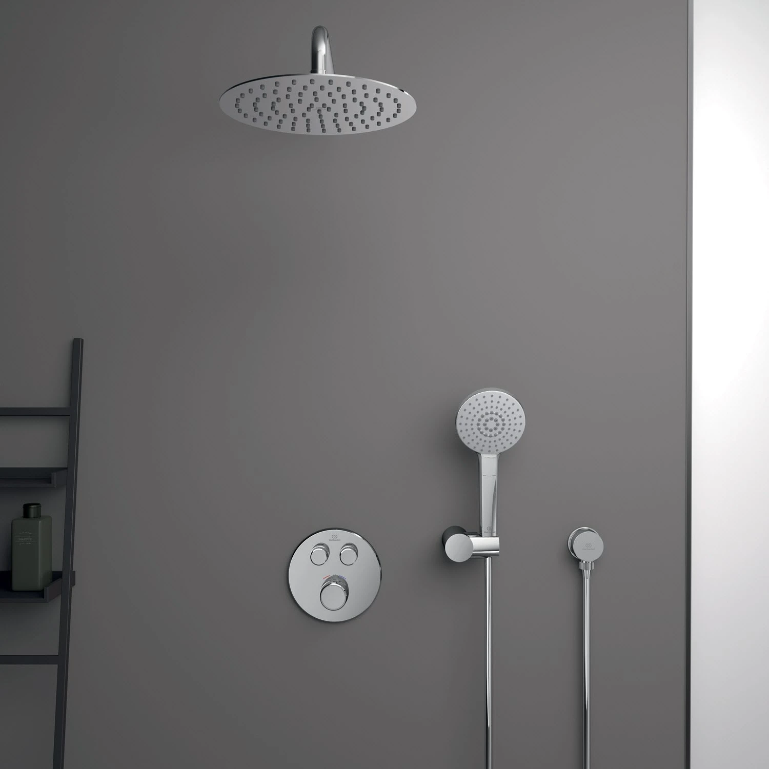 Erleben Sie das ultimative Duschvergnügen mit dem Ceratherm Navigo® Armaturen-Paket von Ideal Standard. Dank der innovativen Navigo®-Technologie können Sie Ihr Duscherlebnis jetzt noch intensiver genießen. Investieren Sie in Komfort, Leistung und Stil für Ihr Badezimmer. Einfache Bedienung auf Knopfdruck Mit der Navigo®-Technologie steuern Sie Ihr Duscherlebnis mit nur einem Knopfdruck. Die ergonomisch gestalteten Metallgriffe bieten nicht nur einen sicheren Halt, sondern ermöglichen auch eine präzise Steuerung durch sanfte Drück- und Drehbewegungen des Bedienknopfes. So haben Sie die volle Kontrolle über den Wasserfluss und die Temperatur, was jedes Duschen zu einem perfekten Moment der Entspannung und Erfrischung macht. Innovative Features für höchsten Komfort und Zuverlässigkeit Genießen Sie Hand- und Regenbrause gleichzeitig und profitieren Sie vom zuverlässigen Verbrühschutz durch die Temperatursperre bei 40 °C. Die schlanke, nur 10 mm hohe Wandrosette aus Metall bietet Langlebigkeit und einen eleganten, minimalistischen Look, der sich perfekt in moderne Badezimmer einfügt. Mühelose Installation für perfekte Leistung Die Ceratherm Navigo® Brausethermostate wurden mit der bewährten Easy-Box Installationstechnologie von Ideal Standard kombiniert. Der Unterputzkörper EASY-Box bildet die solide Basis in der Wand und ermöglicht eine zuverlässige Montage, die sich flexibel an alle Einbausituationen anpassen lässt. Dank des FAST-FIX-Befestigungskonzepts erfolgt die Montage schnell und einfach – ganz ohne Spezialwerkzeug. Das integrierte DICHT-FIX System bietet einen dreifachen Schutz gegen eindringendes und austretendes Wasser und eliminiert somit das Risiko von Leckagen hinter der Wand. Machen Sie Ihr Duscherlebnis perfekt – jetzt zugreifen und den Luxus nach Hause bringen! Armaturen-Paket bestehend aus: -Ideal Standard Brausethermostat Ceratherm Navigo UP Bausatz 2, Chrom -Ideal Standard Unterputz-Bausatz 1 Easy-Box für Einhebelmischer und Thermostate -Ideal Standard Wandanschlussbogen Unterputz Idealrain Atelier, Chrom -Ideal Standard Handbrause-Set Idealrain Evo, Chrom -Ideal Standard Regenbrause Idealrain Luxe Ultra Slim, Edelstahl gebürstet -Ideal Standard Wandanschluss Idealrain Atelier 300 mm, Chrom