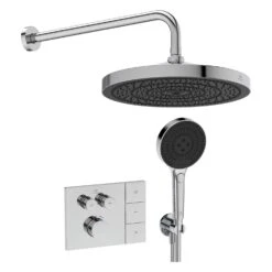 bestehend aus: Brausethermostat: Art.-Nr. A7894AA Unterputz Bausatz 2 für Fertigmontage mit optional montierbarem Rahmen für Solos Regenbrause-Fernbedienung 2 Entnahmestellen Rückflussverhinderer Griff aus Metall Rosette 21,3 x 15,7 cm Thermostatkartusche mit Wachsdehnstoffelement Heißwassertemperaturbegrenzer Temperatursperre: 40 °C Heißwassertemperatureinstellung mit Verbrühschutz DICHT-FIX System: Separate Abdichtung jeder Öffnung für optimalen Schutz des Bauwerks gegen Feuchtigkeit und Wasser Geräuschverhalten DIN 4109: Gruppe 1 Lebensdauer: DIN EN 200, DIN EN 1111 Wandanschlussbogen: Art.-Nr. BC807AA Unterputz mit Brausehalter Rückflussverhinderer DVGW eigensicher Brauseschlauchanschluss G1/2 Wandanschluss G1/2 Brauseschlauch: Art.-Nr. BE175AA Idealflex Anschluss G1/2 Handbrause: Art.-Nr. A7896AA Strahlarten: 3 (Regen, sanfter Regen und Massage) Ø 13 cm Navigo Druckknopfumschaltung EasyClean Anschluss G1/2 Brausearm: Art.-Nr. B9445AA Aufputz Anschluss G1/2 Kopfbrause: Art.-Nr. A7889AA Strahlarten: 3 (Regen, sanfter Regen und Massage) Ø 30 cm Kugelgelenk EasyClean Anschluss G1/2 Strahlartenumstellung per Fernbedienung (im Lieferumfang enthalten) Batteriebetrieb (6 V) Zur Montage wird der Unterputz-Bausatz 1 Easy-Box Art.-Nr. A1000NU benötigt, bitte separat bestellen.