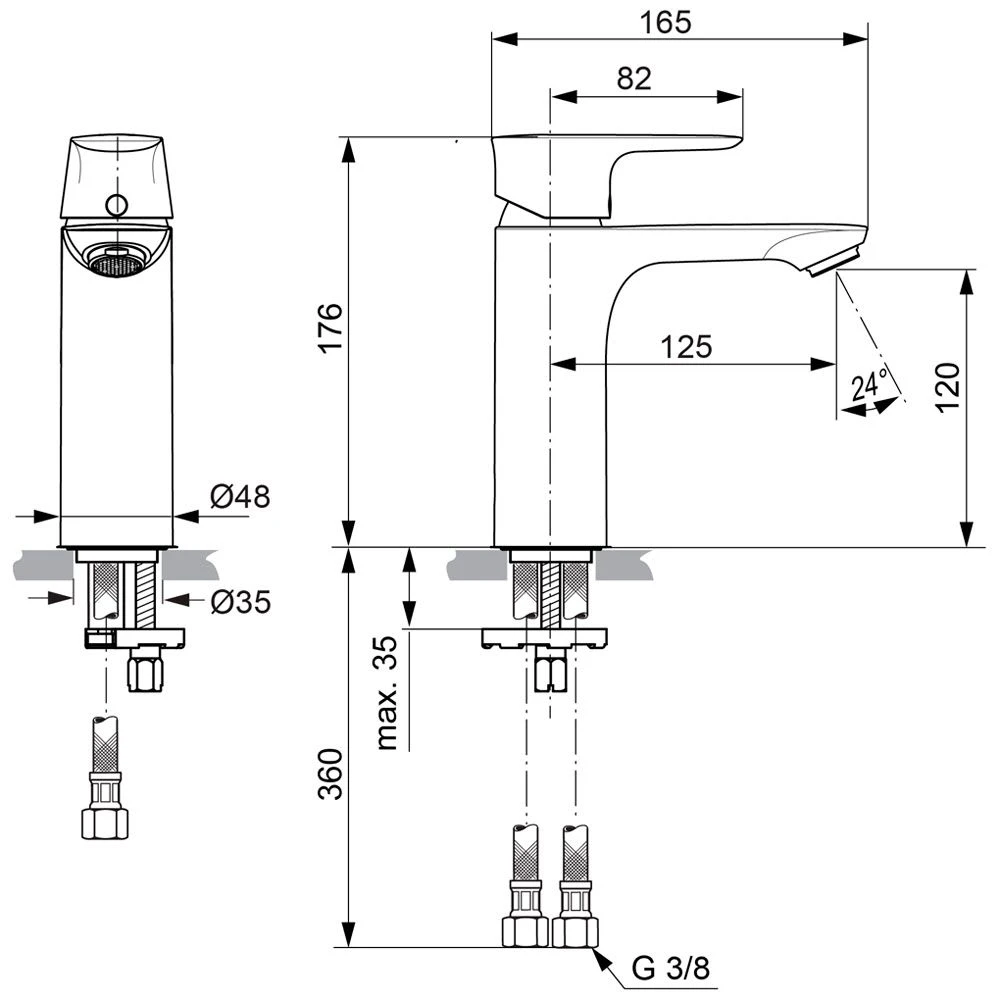 Eigenschaften: starrer Gussauslauf ohne Ablaufgarnitur Luftsprudler mit Metallring und druckunabhängigem Mengenregler 5 l/min. flexible Anschlussschläuche G3/8 Befestigung von unten (EASY FIX) mit Zentrierdichtung 3,8 cm Ø Kartusche mit keramischen Dichtscheiben integrierter Heißwassertemperaturbegrenzer