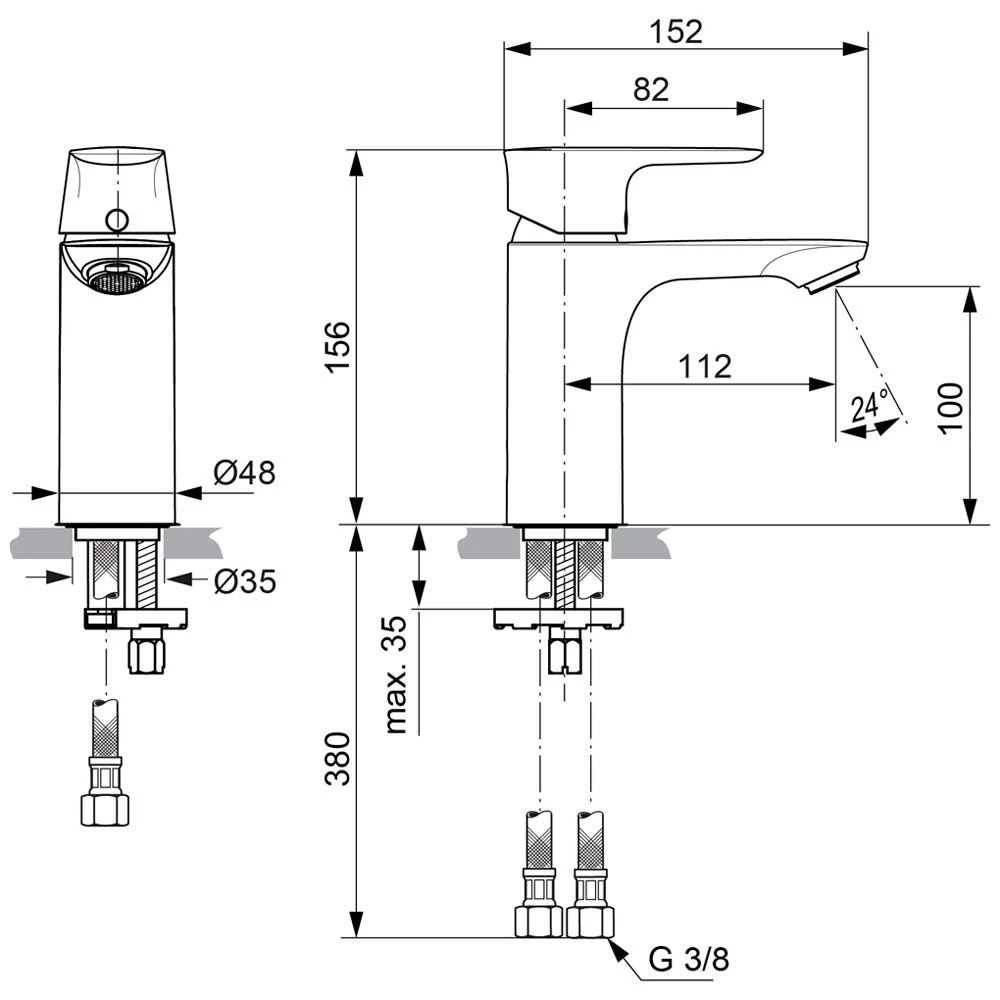 Eigenschaften: starrer Gussauslauf ohne Ablaufgarnitur Luftsprudler mit Metallring und druckunabhängigem Mengenregler 5 l/min. flexible Anschlussschläuche G3/8 Befestigung von unten (EASY FIX) mit Zentrierdichtung 3,8 cm Ø CLICK-Kartusche mit keramischen Dichtscheiben integrierter Heißwassertemperaturbegrenzer