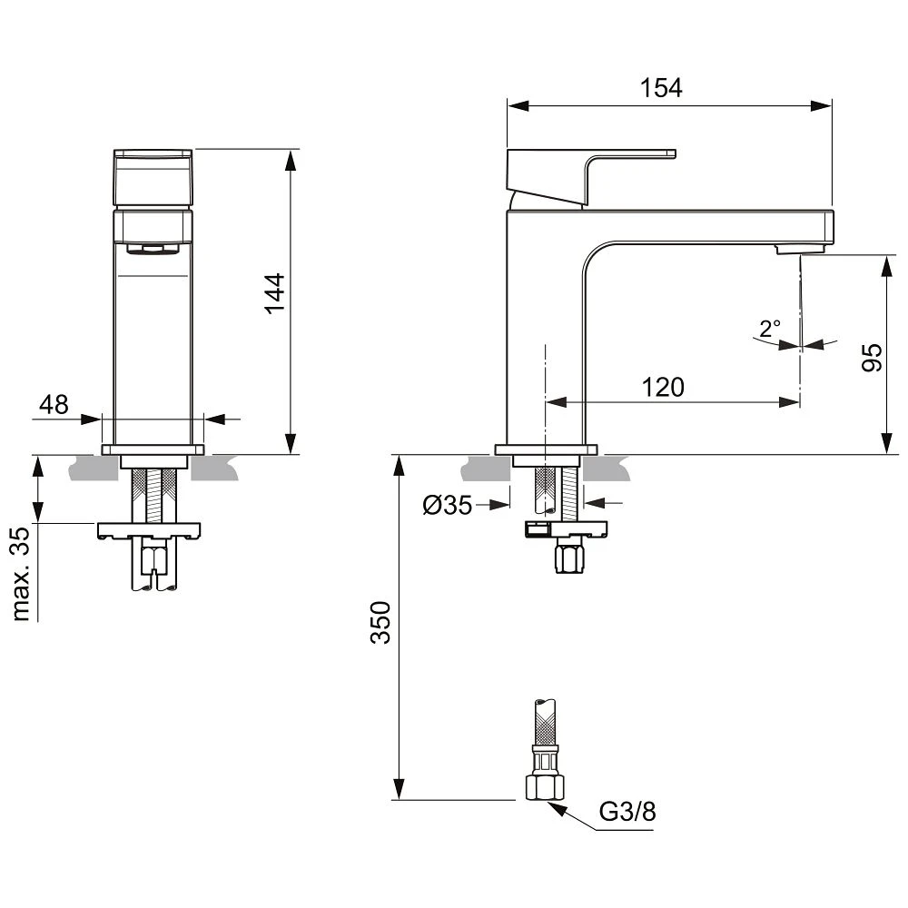 Eigenschaften: Einhebel-Waschtischarmatur Slim DN 15 mit schlankem Körper mit starrem Gussauslauf Luftsprudler mit Metallring und druckabhängigem Mengenregler 5 l/Min Befestigung von unten (EASY FIX) mit Zentrierdichtung Körperdurchmesser 3,7 cm Sockelmaß mit Rosette 4,8 cm ohne Ablaufgarnitur Ausladung 12 cm Auslaufhöhe 9,5 cm flexible Anschlussschläuche G 3/8 Kartusche Ø 2,5 cm mit keramischen Dichtscheiben Schwenkbereich 90 Grad