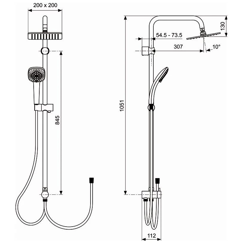 Eigenschaften: wasserführende Brausestange mit schwenkbarem Druckknopf-Schieber Kopfbrause aus Metall 20 x 20 cm Funktionshandbrause mit 3 Strahlarten: Regen, Platzregen und Massagestrahl Anti-Kalk-Funktion Brauseschlauch 175 cm Verbindungsschlauch 50 cm Umschaltung integriert Höhe Mitte Armatur bis Oberkante Brausearm 105,1 cm Ausladung Mitte Brausestange bis Mitte Kopfbrause 30,7 cm Durchflussmenge pro Minute bei 3 bar: 12/8 Liter