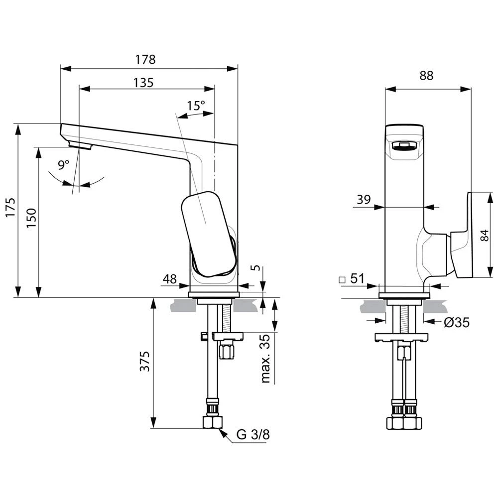 Eigenschaften: mit hohem Auslauf ohne Ablaufgarnitur starrer Gussauslauf Luftsprudler mit druckunabhängigem Mengenregler 5 l/Min einstellbarer Strahlwinkel mit Neigungswinkel 9 +/- 10 Grad flexible Anschlussschläuche G3/8 Bedienungshebel aus Metall mit Rot-/Blau-Markierung auf dem Hebel Befestigung von unten (EASY FIX) mit Zentrierdichtung Kartusche mit keramischen Dichtscheiben integrierte Heißwasser-Temperaturbegrenzung Ausladung 13,5 cm