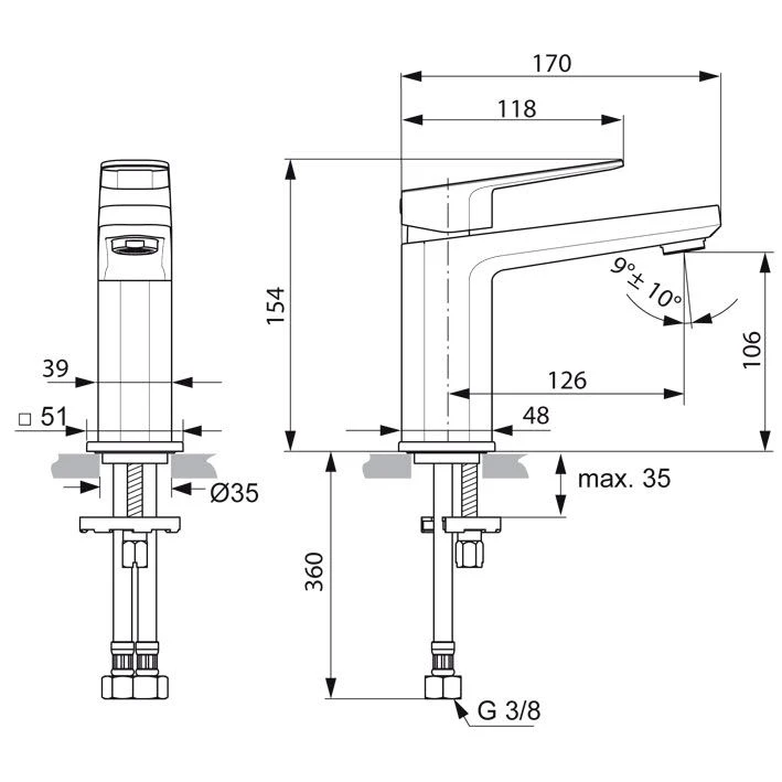 Eigenschaften: ohne Ablaufgarnitur starrer Gussauslauf Luftsprudler mit druckunabhängigem Mengenregler 5 l/Min. einstellbarer Strahlwinkel mit Neigungswinkel 9 +/- 10 Grad flexible Anschlussschläuche G 3/8 Bedienungshebel aus Metall, Schwenkbereich 90 Grad mit Rot-/Blau-Markierung auf dem Hebel Befestigung von unten EASY FIX mit Zentrierdichtung Kartusche Ø 28 mm, mit keramischen Dichtscheiben integrierte Heißwasser-Temperaturbegrenzung