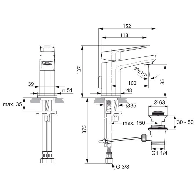 Eigenschaften: mit Ablaufgarnitur starrer Gussauslauf Luftsprudler mit druckunabhängigem Mengenregler 5 l/Min. einstellbarer Strahlwinkel mit Neigungswinkel 9 +/- 10 Grad Zugknopf-Ablaufgarnitur (?) Zugknopf-Ablaufgarnitur Excenter-Garnitur ist der Ablauf unten im Waschbecken. G 1 1/4 flexible Anschlussschläuche G 3/8 Bedienungshebel aus Metall, Schwenkbereich 90 Grad mit Rot-/Blau-Markierung auf dem Hebel Befestigung von unten EASY FIX mit Zentrierdichtung Kartusche Ø 28 mm, mit keramischen Dichtscheiben integrierte Heißwasser-Temperaturbegrenzung Ausladung 10 cm
