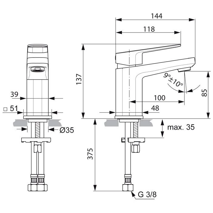 Eigenschaften: ohne Ablaufgarnitur starrer Gussauslauf Luftsprudler mit druckunabhängigem Mengenregler 5 l/Min. einstellbarer Strahlwinkel mit Neigungswinkel 9 +/- 10 Grad flexible Anschlussschläuche G 3/8 Bedienungshebel aus Metall, Schwenkbereich 90 Grad mit Rot-/Blau-Markierung auf dem Hebel Befestigung von unten EASY FIX mit Zentrierdichtung Kartusche Ø 28 mm, mit keramischen Dichtscheiben integrierte Heißwasser-Temperaturbegrenzung Ausladung 10 cm