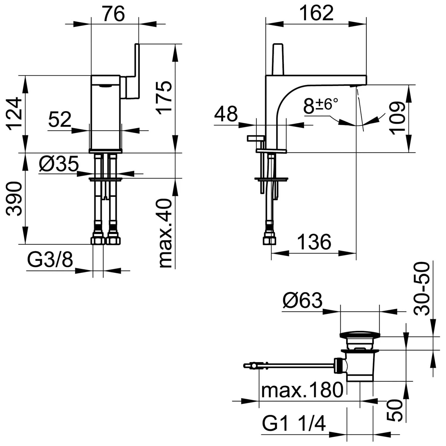 Eigenschaften: geradliniges Design und klare, geometrische Formensprache zur Standmontage Einlochmontage mit Schnellmontagesystem Bedienhebel rechts mit Zugstangen-Ablaufgarnitur (?) Zugstangen-Ablaufgarnitur Excenter-Garnitur ist der Ablauf unten im Waschbecken. mit eckiger Rosette, 5,2 x 5,2 cm Mischwasserkartusche mit keramischen Dichtscheiben Luftsprudler für einen wohlgeformten Wasserstrahl Strahlwinkel um ± 6° verstellbar Durchflussmenge begrenzt auf 7,6 l/min für Durchlauferhitzer geeignet geräuschgeprüft leicht zu reinigen Oberflächen von Hand in hauseigener KEUCO Galvanik veredelt Anschlussart: Anschlussschläuche G 3/8 Auslaufhöhe: 10,9 cm Hinweise: Made in Germany Designer: Dominik Tesseraux Herstellergarantie: 3 Jahre (zusätzlich zur gesetzlichen Gewährleistung von 2 Jahren) Ersatzteilversorgung: 10 Jahre
