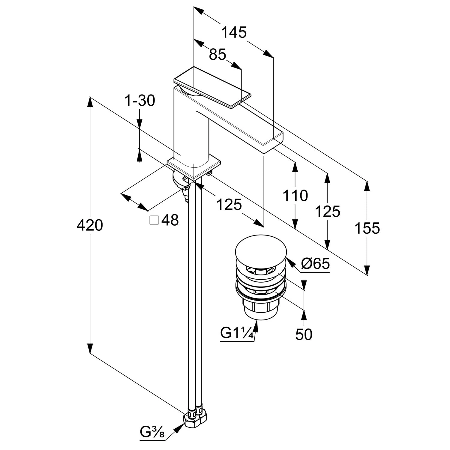 Eigenschaften: für 1-Loch Montage Auslasshöhe 11 cm geschlossener Hebel, Metall Strahlregler M18,5 PCA Keramik-Kartusche mit Heißwasserbegrenzung Durchflussmenge bei 3 bar 4,5 l/min. flex. Druckschläuche G3/8 DVGW zugelassen Schnell-Montagesystem mit Push open Ablaufgarnitur G1 1/4