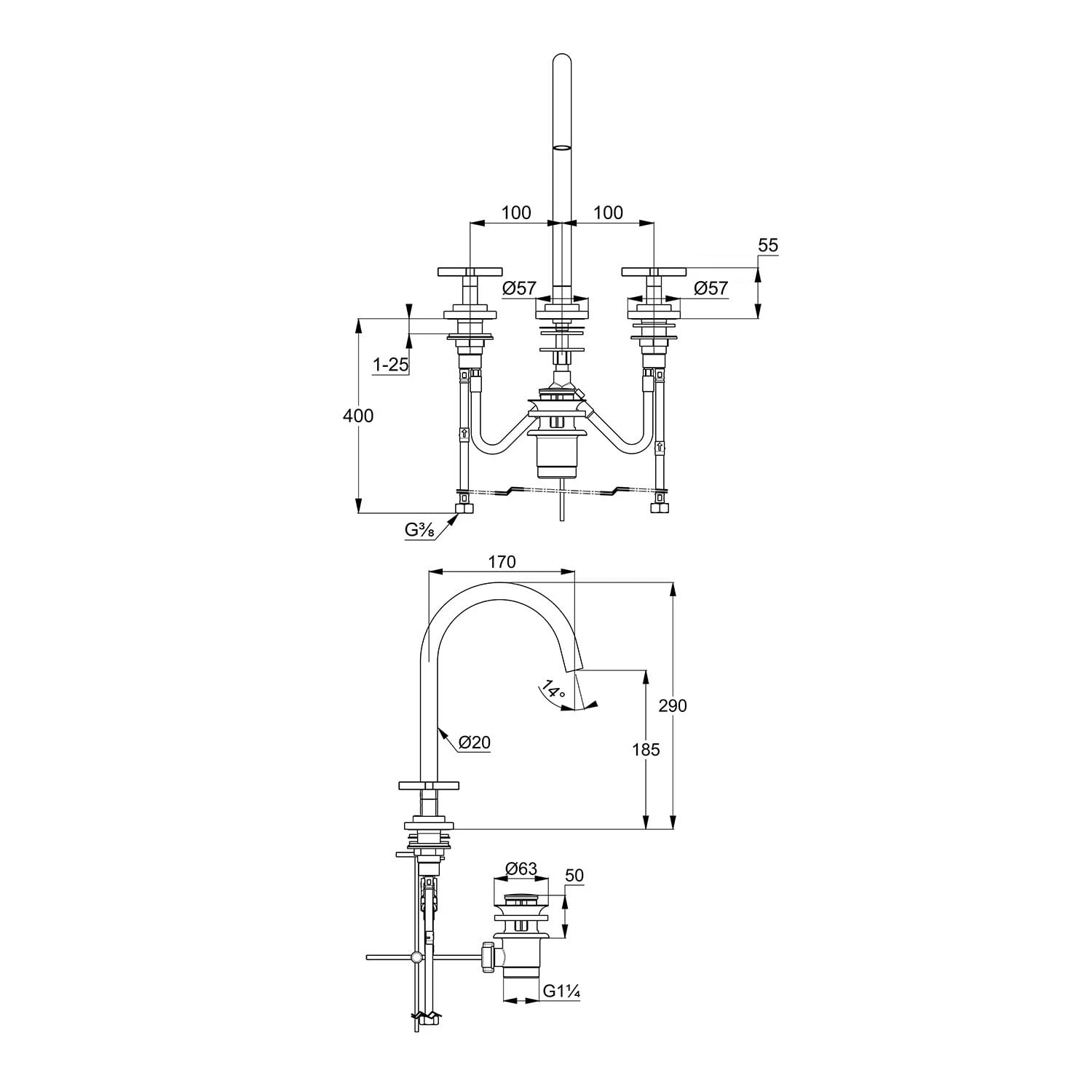 Eigenschaften: Waschtisch-Dreilocharmatur DN 15 Kreuzgriff aus Metall Strahlregler M 18,5 x 1 PCA Laminar Soft-Start Keramik-Oberteile 90° Durchflussmenge 5,6 l/min bei 3 bar schwenkbarer (150° / 360°) oder arretierbarer Auslauf flexible Druckschläuche G 3/8 mit Schaftbefestigung Ablaufgarnitur G 1 1/4 aus Metall Auslaufhöhe Unterkante 18,5 cm