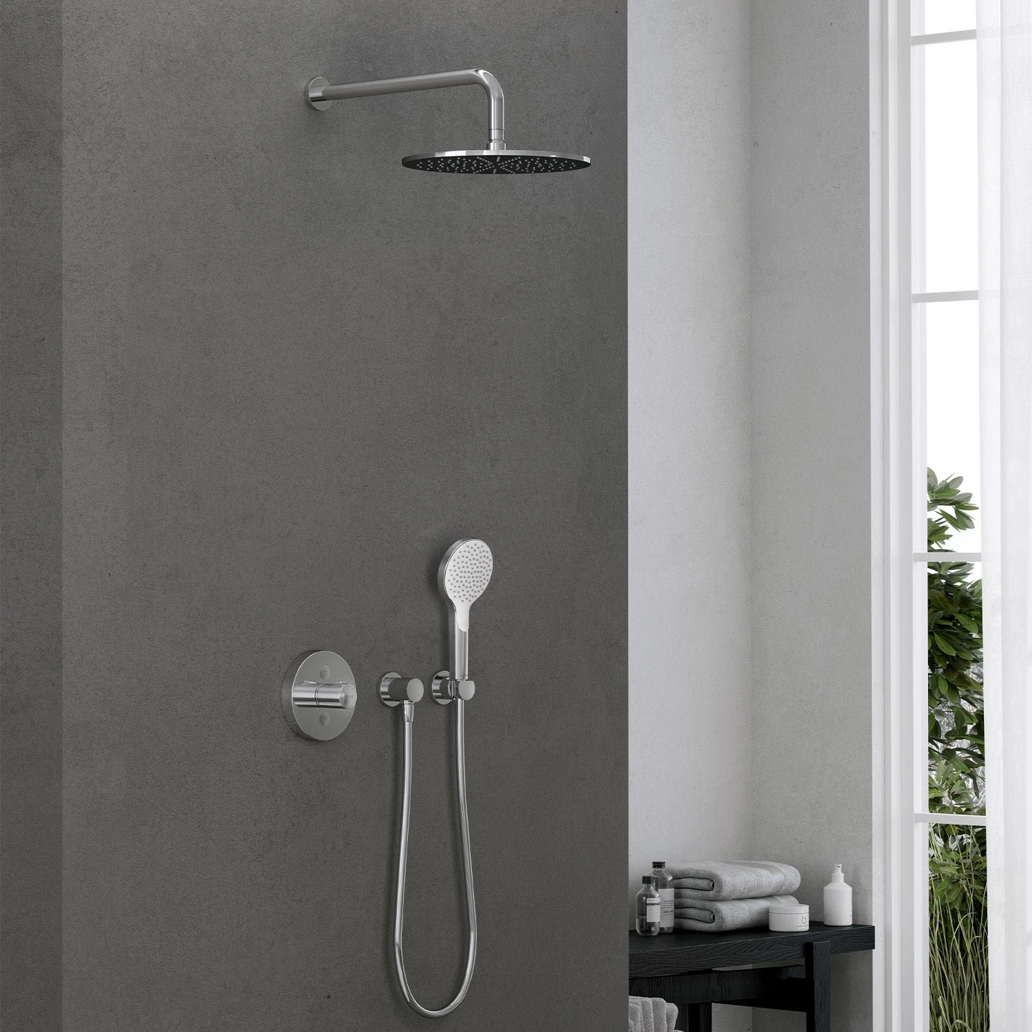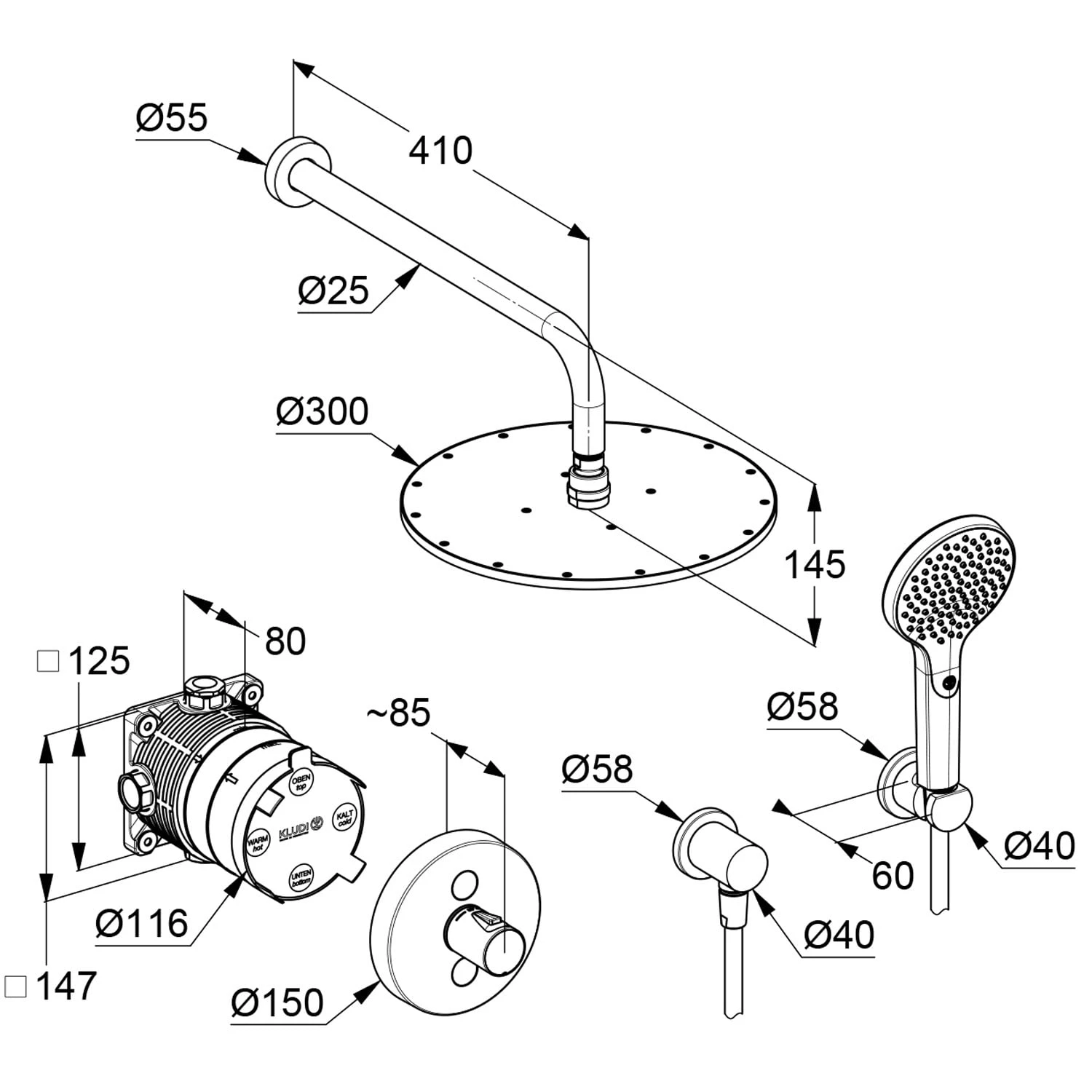 bestehend aus: A-QA Tellerkopfbrause 30 cm A-QA Brausearm 40 cm Push UP-THM 2 Verbraucher FLEXX.BOXX UP-Rohbauset Wannen-Brauseset DIVE X 1S Schlauchanschlussbogen Kopfbrause: aus Metall/Kunststoff verchromt 23 l/min. bei 3 bar Fließdruck es wird für ein ausreichendes Strahlbild an der Kopfbrause ein freier Mindestdurchfluss von > 9,0 l/min benötigt mit Kugelgelenk mit Anschlussgewinde IG 1/2 mit Kalkschnellreinigung für geschlossene Trinkwassererwärmer Durchflusswassererwärmer geeignet PN 5 Brausearm: Ausladung 40 cm Anschluss 1/2″ mit Schubrosette Ø 5,5 cm Thermostat: Unterputz-Thermostatarmatur Feinbau-Set mit Funktionseinheit mit Drucktaste für Ansteuerung von zwei Verbrauchern Heißwassersperre 38 °C runde Rosette UP-Körper: Unterputz-Rohbauset für Wandeinbau mit einteiligem Elastomere-Mantel mit Rohbau-Schutzkappe mit zusätzlicher Dichtmanschette mit Spülanschluss-Set entzinkungsarmes Messing ohne Feinbau-Set / Funktionseinheit unter vielen UP-Armaturen einbaubar Brauseset: Handbrause DIVE X 1S mit einer Strahlart mit Kalkschnellreinigung Gewindeanschluss G 1/2 Siebdichtung Brauseschlauch G 1/2 x G 1/2 x 125 cm kunststoffummantelt mit konischen Muttern Wand-Brausehalter mit Befestigungsmaterial zur starren Wandmontage